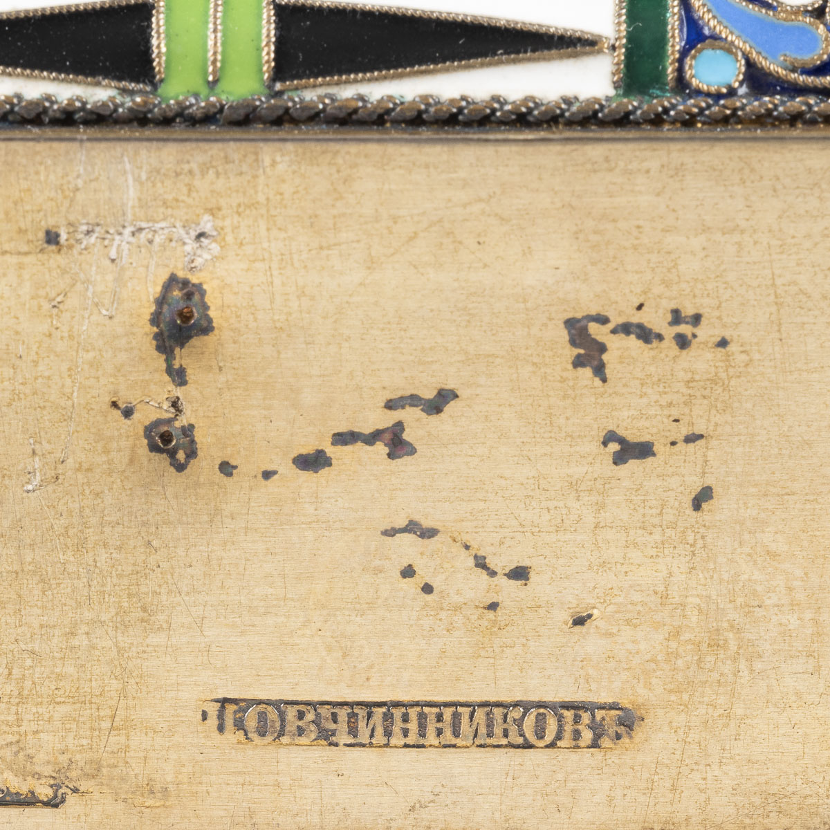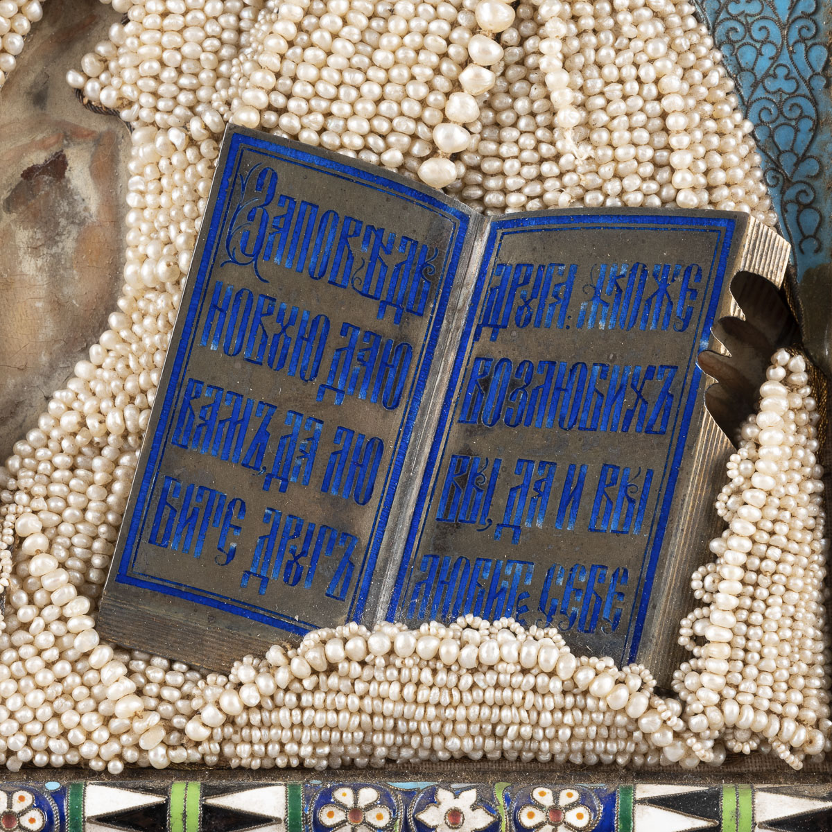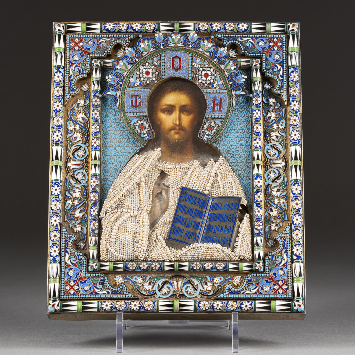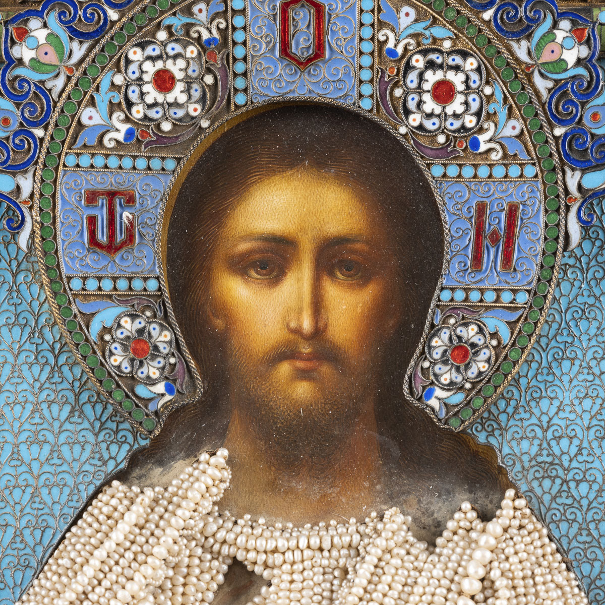 Holztafel mit zwei Rückseiten-Sponki, verso Samtabdeckung | Eitempera | Oklad aus vergoldetem Silber, Email, Perlbesatz | 27 x 22,3 cm | Punziert mit Beschaumeisterzeichen und Meistermarke ‚P. OWTSCHINNIKOW‘ in Kyrillisch | Min. Substanzverluste.