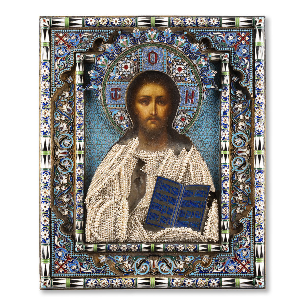 GROSSE IKONE MIT CHRISTUS PANTOKRATOR MIT CLOISONNÉ-EMAIL-OKLAD
