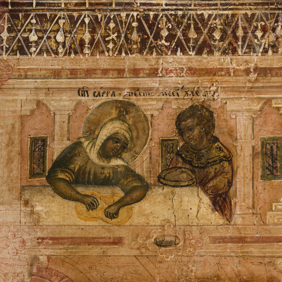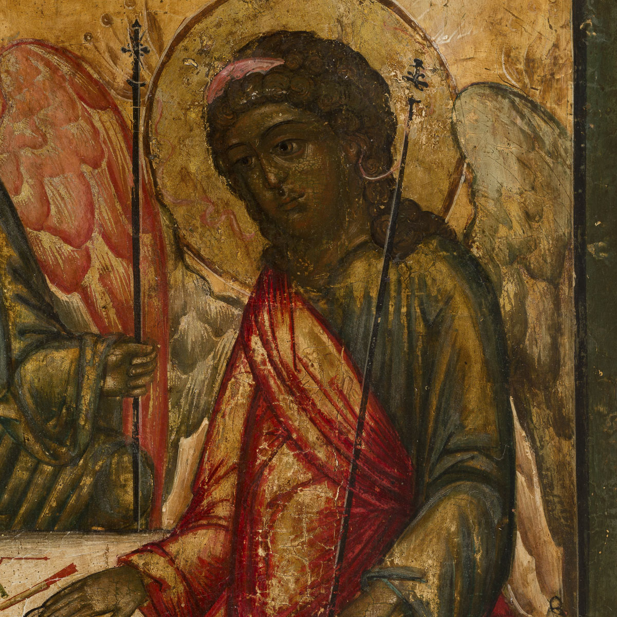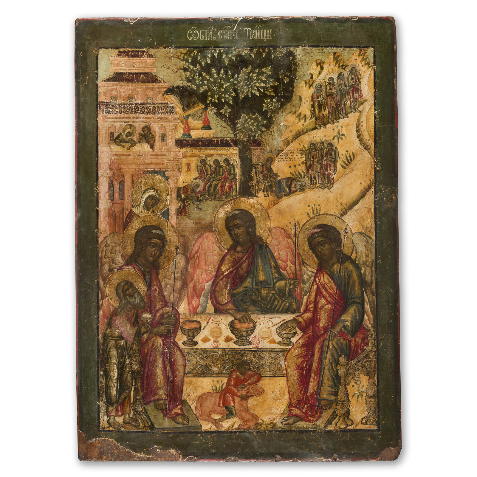 Die Ikone zeigt drei Engel um einen gedeckten Tisch, Abraham und Sarah, sowie einen Diener, der ein Kalb schlachtet. Die obere Hälfte thematisiert die Ankunft der Engel, Fußwaschung und Abschied. Die Ikonenmalerei ist reich verziert, partiell vergoldet und trägt eine ausführliche Inschrift zur Geschichte. Diese nennt den Auftraggeber, Zar Alexei Michailowitsch, und beschreibt die Kirchenweihe. Die Ikonenmaler Jermolaj, Jakov Sergeew und Pjotr Semjonow schufen das Werk im Jahr 1682. Es repräsentiert ein wichtiges Stück religiöser Kunst aus dem 17. Jahrhundert in Russland.