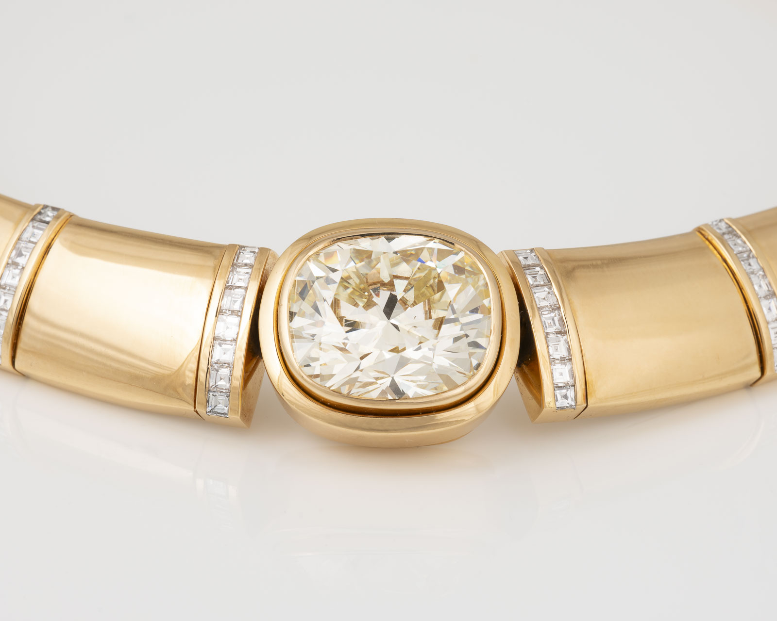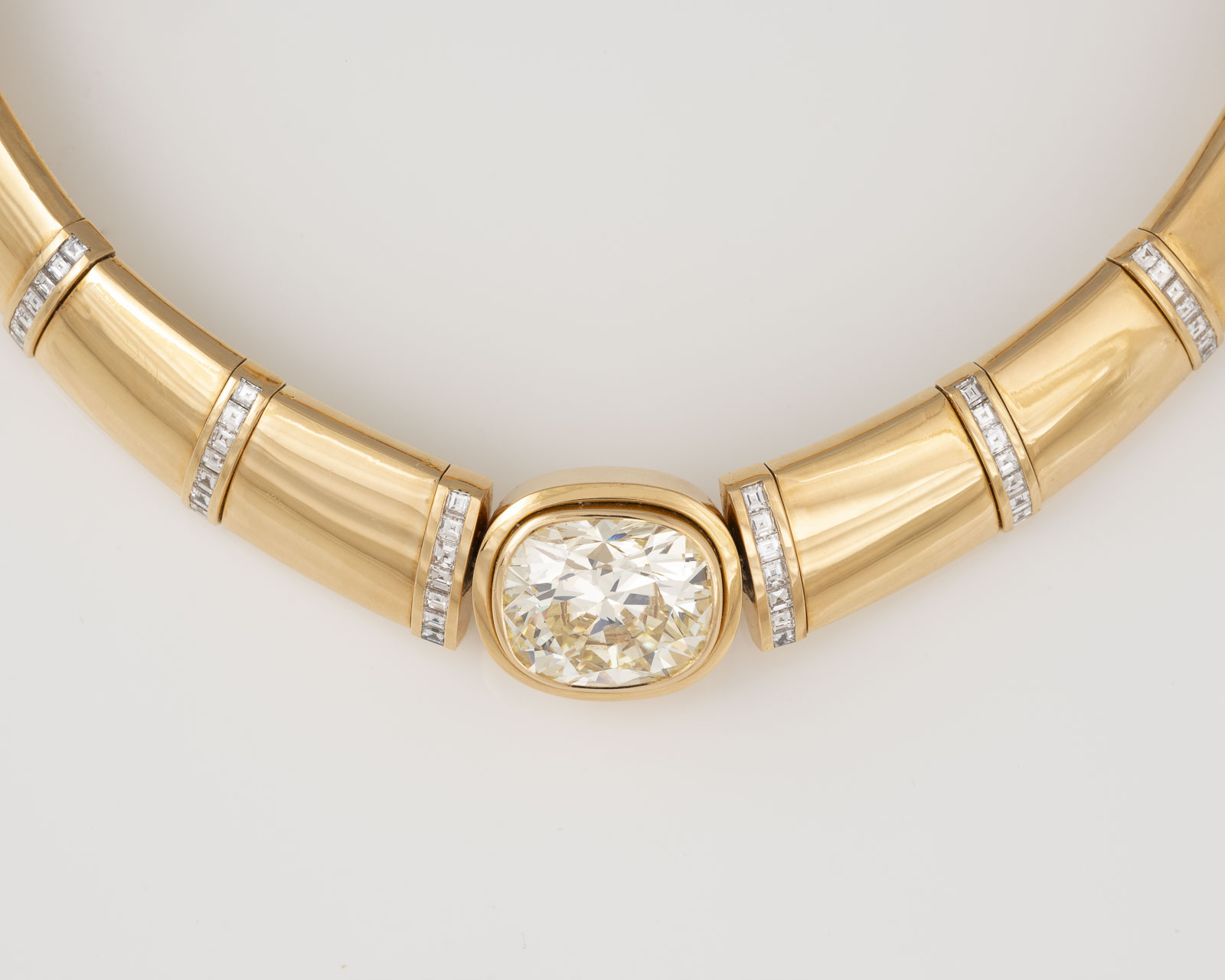 Gelbgold | Häng-L. ca. 11,5 cm, Ges.-Gew. ca. 142,35 g. Gest. 750 | Ein natürlicher Diamant, Cushion Modified Brilliant, ca. 22.00 ct. (17.40 x 15.10 x 9.85mm) | 42 natürliche Diamanten