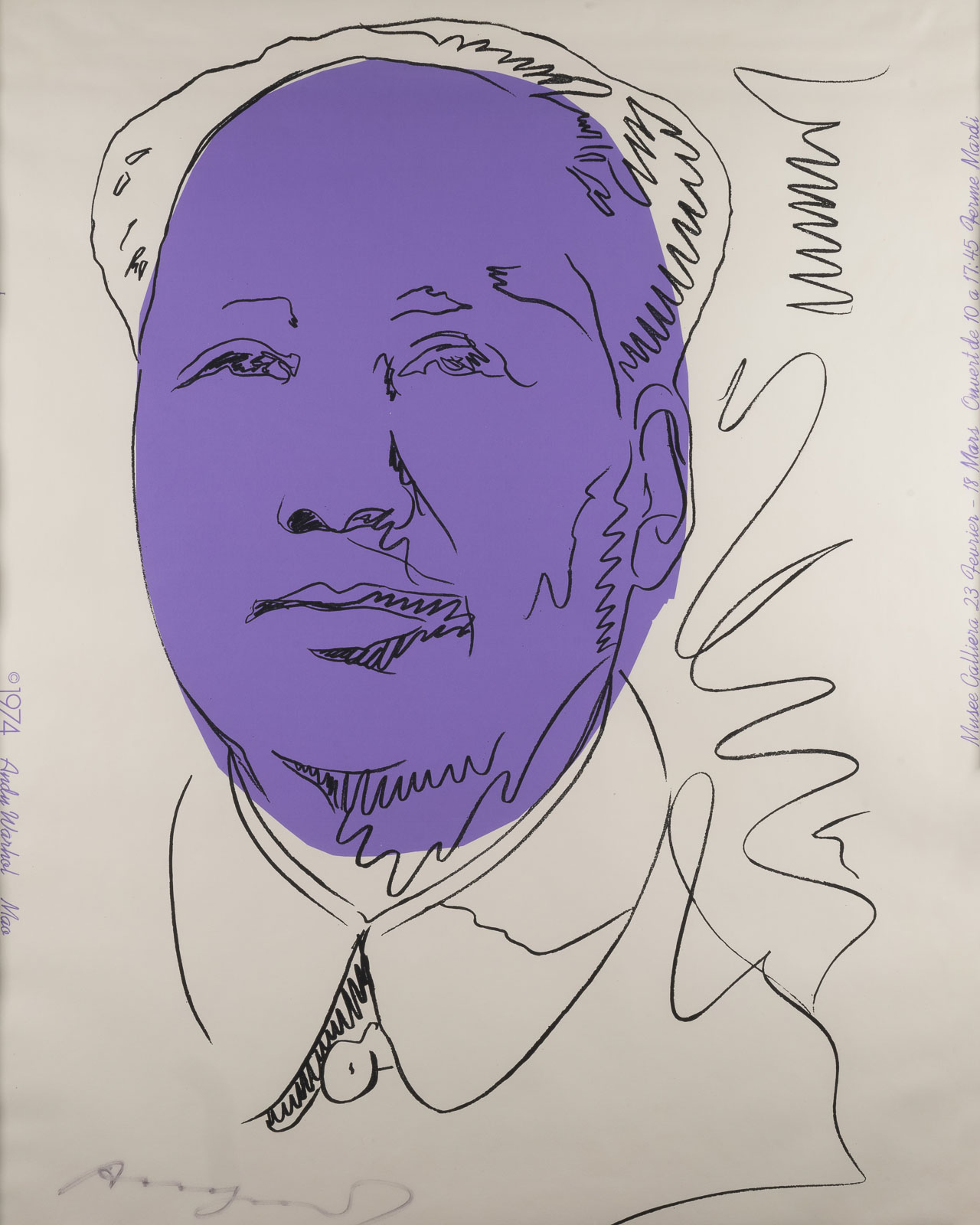 Farbserigrafie in Lila und Schwarz auf Tapete | BM 101 x 75 cm (R. 113 x 86 x 3 cm)| Unten links handsigniert| Verso: Rahmenrückseite mit Klebeetikett der Galerie Vayhinger, Radolfzell| Erschienen anlässlich der Andy Warhol Ausstellung im Musée Galliera, Paris 1974| Edition Factory Additions, New York | Das Blatt ist eines von wahrscheinlich 100 signierten Exemplaren | Part. min. fleckig, im unteren Bereich min. gewellt | Auf Karton montiert und hinter Glas gerahmt