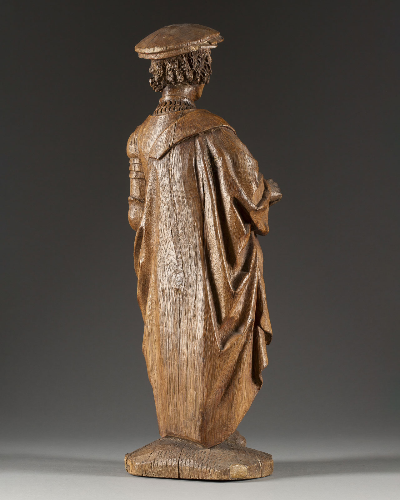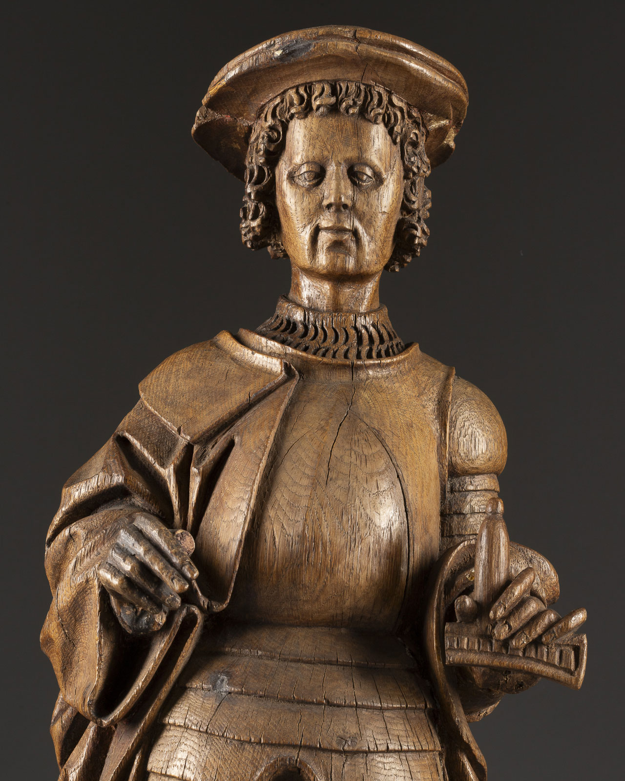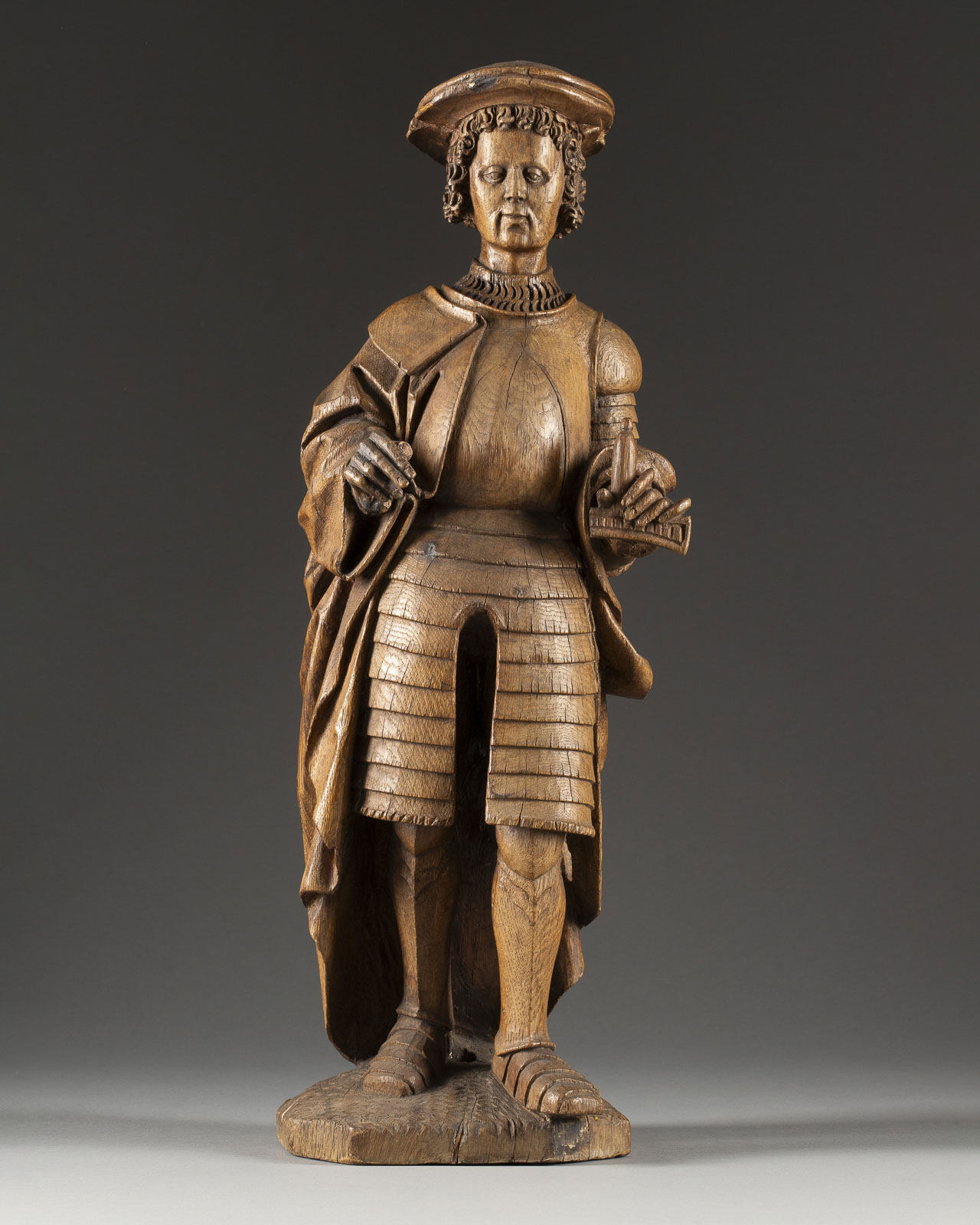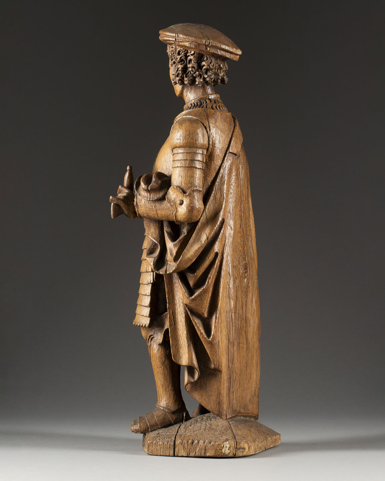 Eichenholz, vollplastisch geschnitzt, rückseitig leicht geflacht, auf Sockel | H. 56, B. 19, T. 16 cm, Gew. ca. 3,99 kg | Luchtenberg Sammlungsinventarnummer ‚B/m 15‘ | Vollplastische Darstellung des Heiligen Viktors, mit Barett und einem über die Rüstung tragenden Mantel, in der linken Hand ein Schwertgriff haltend (Klinge fehlt.) | Part. best. und rest., Hände neu angesetzt, vorder- und rückseitig Spannungsrisse