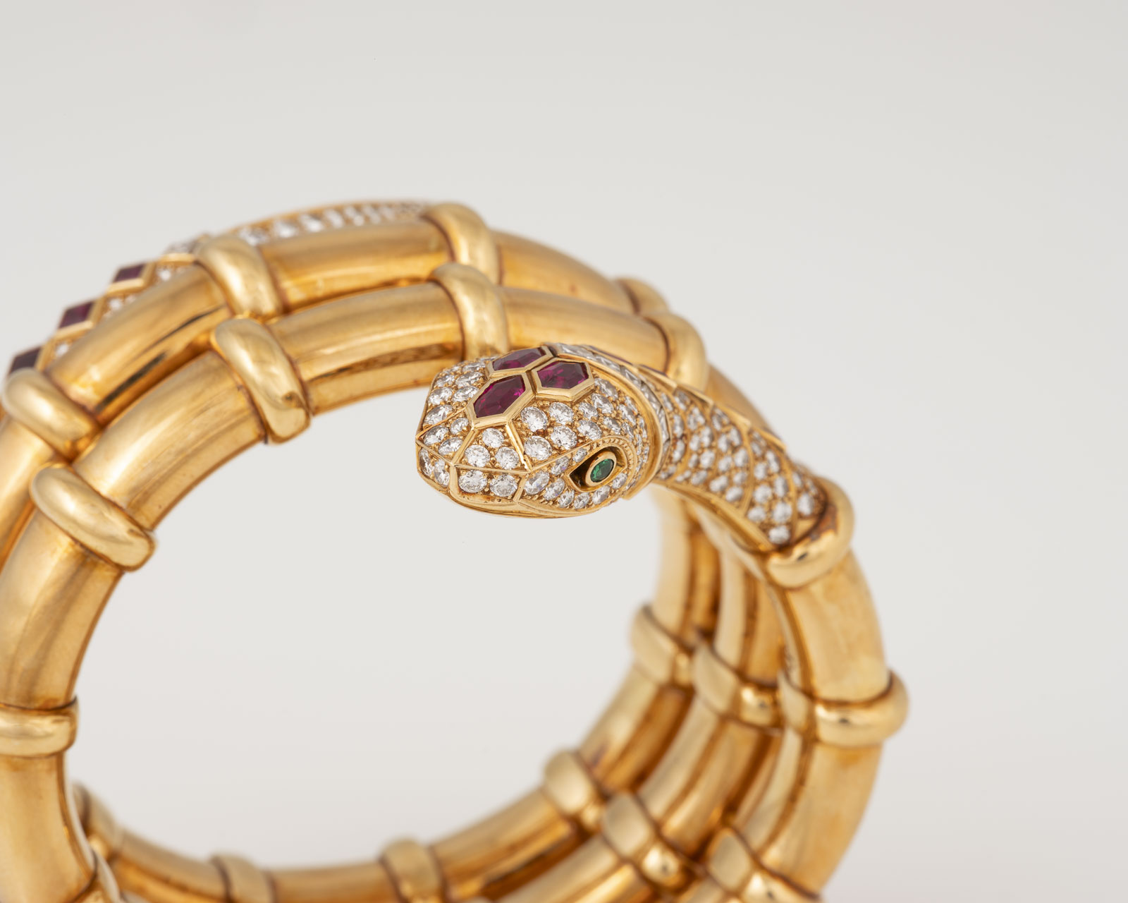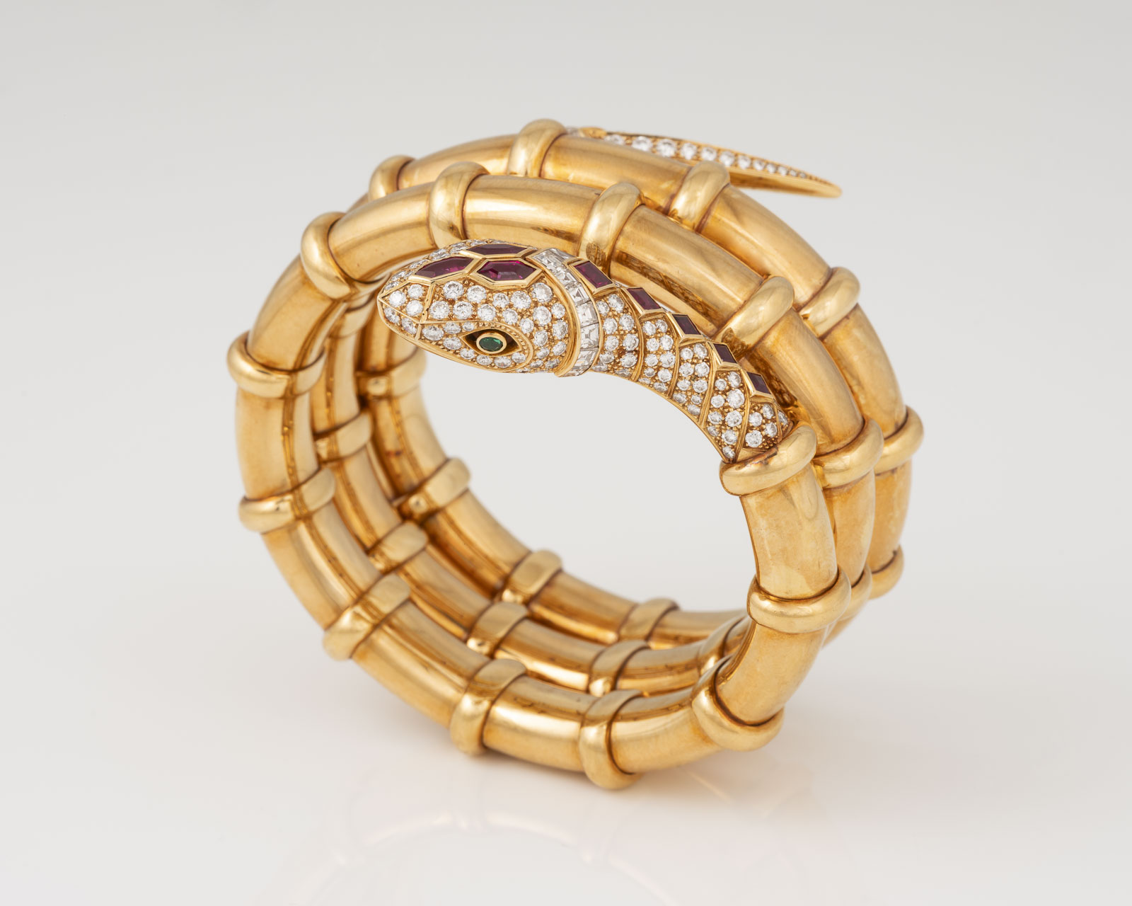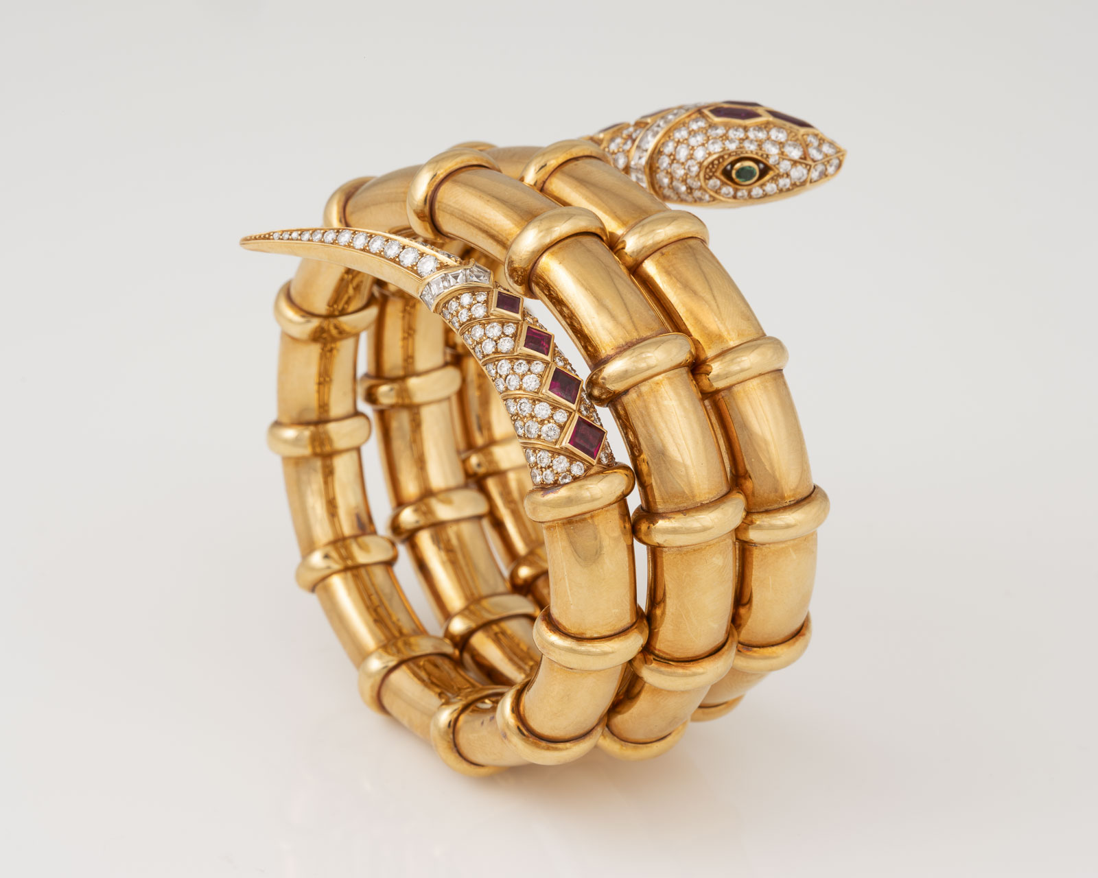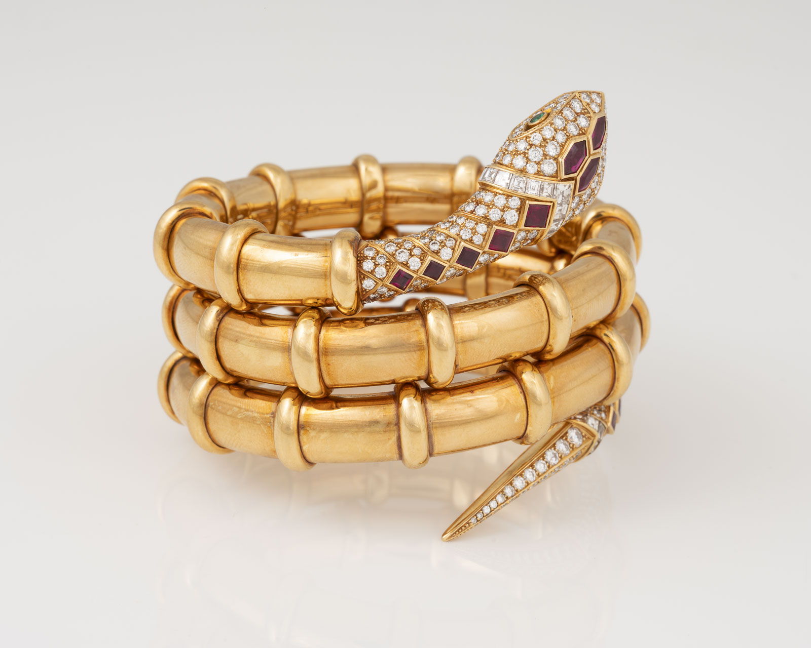 18 Karat Gelbgold | Schlangenarmreif mit zwei rund facettierten Tsavoriten als Augen, 12 facettierten Rubinen, zus. ca. 4,30 ct. sowie Diamanten im Brillant- und Carree-Schliff, zus. ca. 7,50 ct. | Literatur: Abgebildet in: Georg Hornemann, Dumont Verlag, Köln 2003, Seite 124.