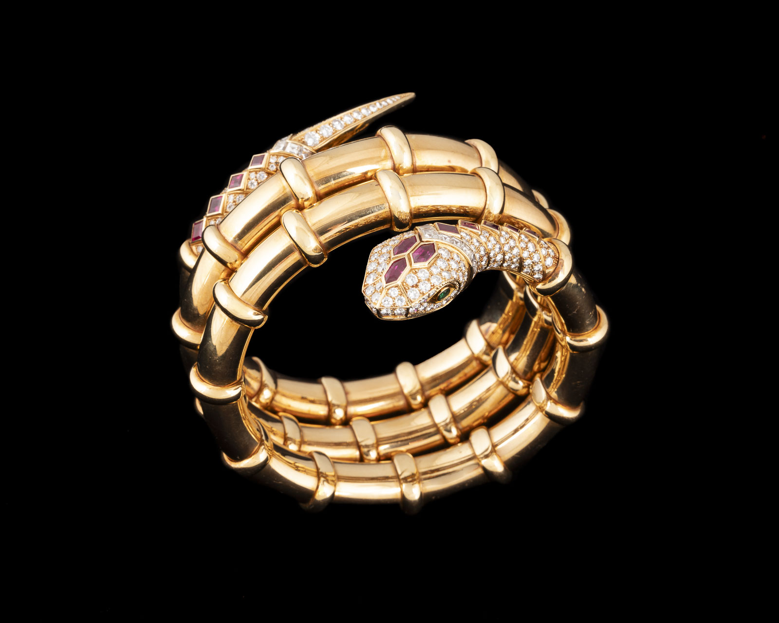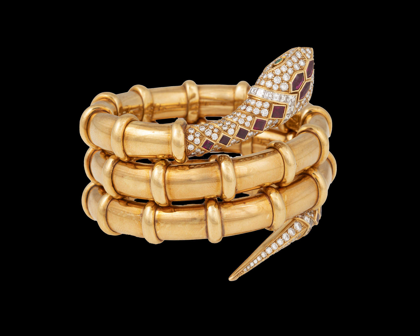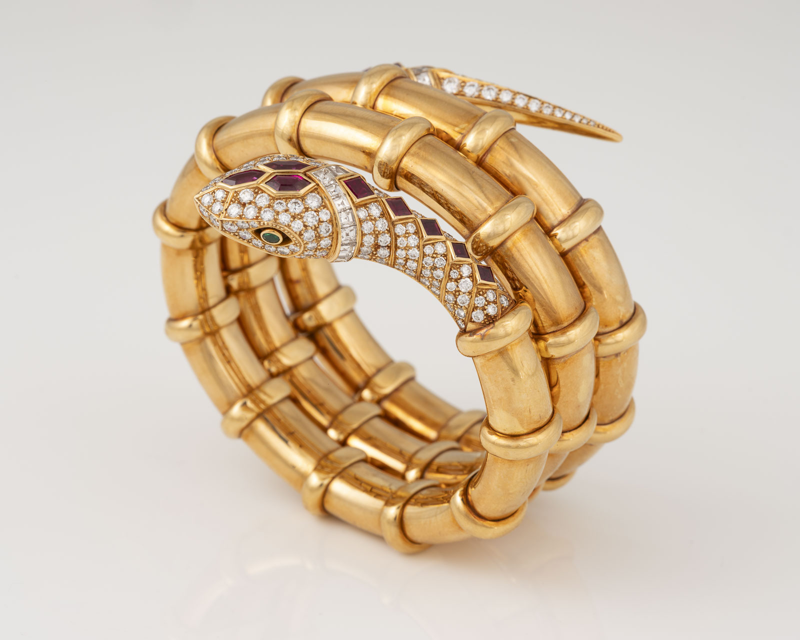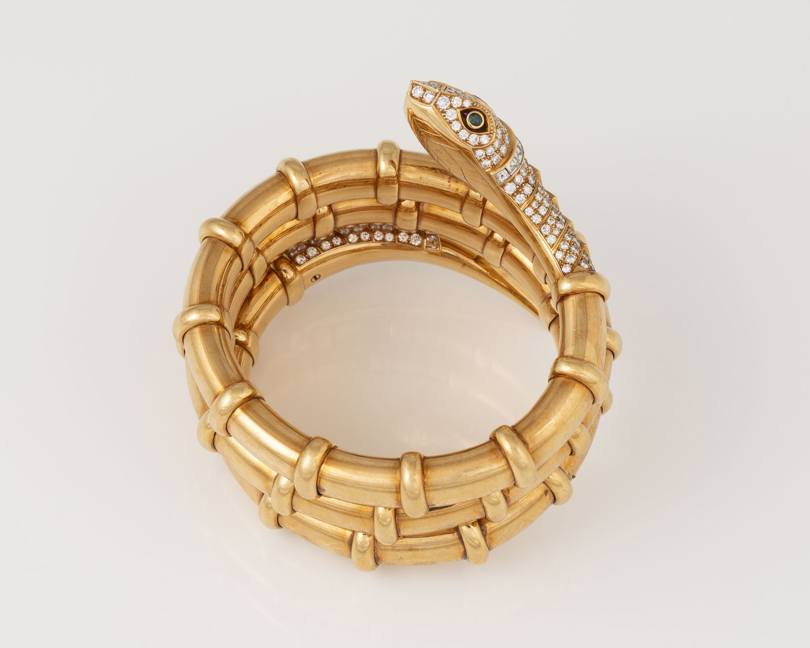 18 Karat Gelbgold | Schlangenarmreif mit zwei rund facettierten Tsavoriten als Augen, 12 facettierten Rubinen, zus. ca. 4,30 ct. sowie Diamanten im Brillant- und Carree-Schliff, zus. ca. 7,50 ct. | Literatur: Abgebildet in: Georg Hornemann, Dumont Verlag, Köln 2003, Seite 124.