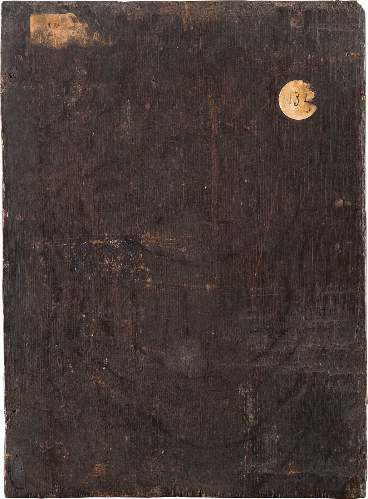 Verso: Auf der Holztafel mit zwei alten Papieretiketten. Eines mit Sammlungs- oder Auktionsnummer '134.'. Part. altrest., min. Altretuschen. Provenienz: Privatsammlung Berlin.