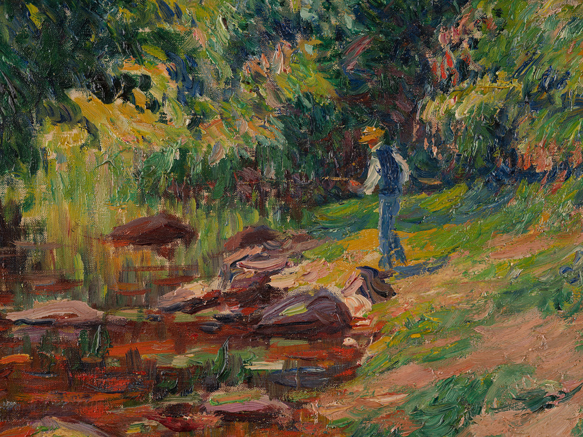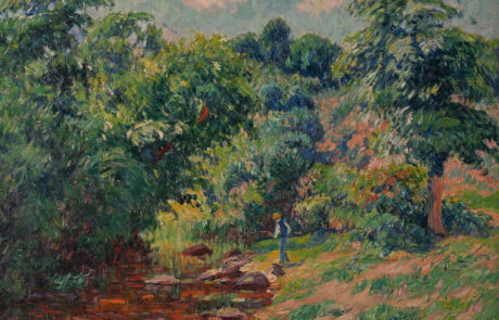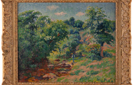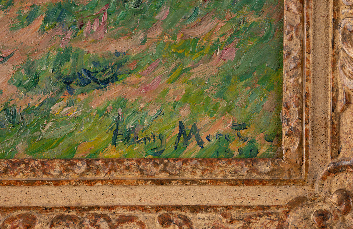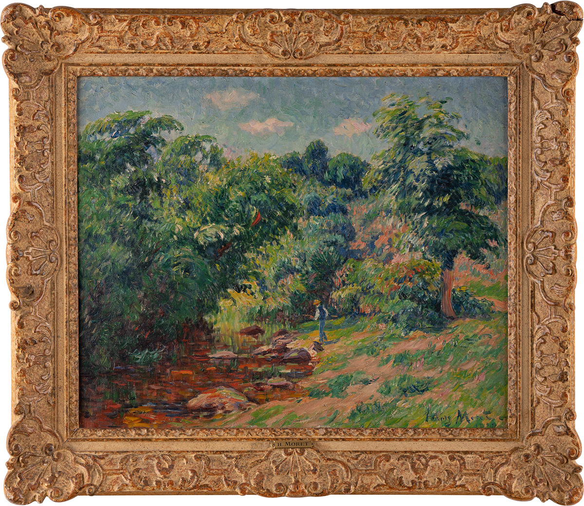 Signiert und datiert unten rechts 'Henry Moret 1910'. Verso: Auf Keilrahmen handschr. bez., betitelt und nummeriert sowie auf handschr. Etikett auf Keilrahmen bez. '9377 - Moret - Rivière de Pont-Aven. Finistère 1910'. Provenienz: Sammlung Rheinland.