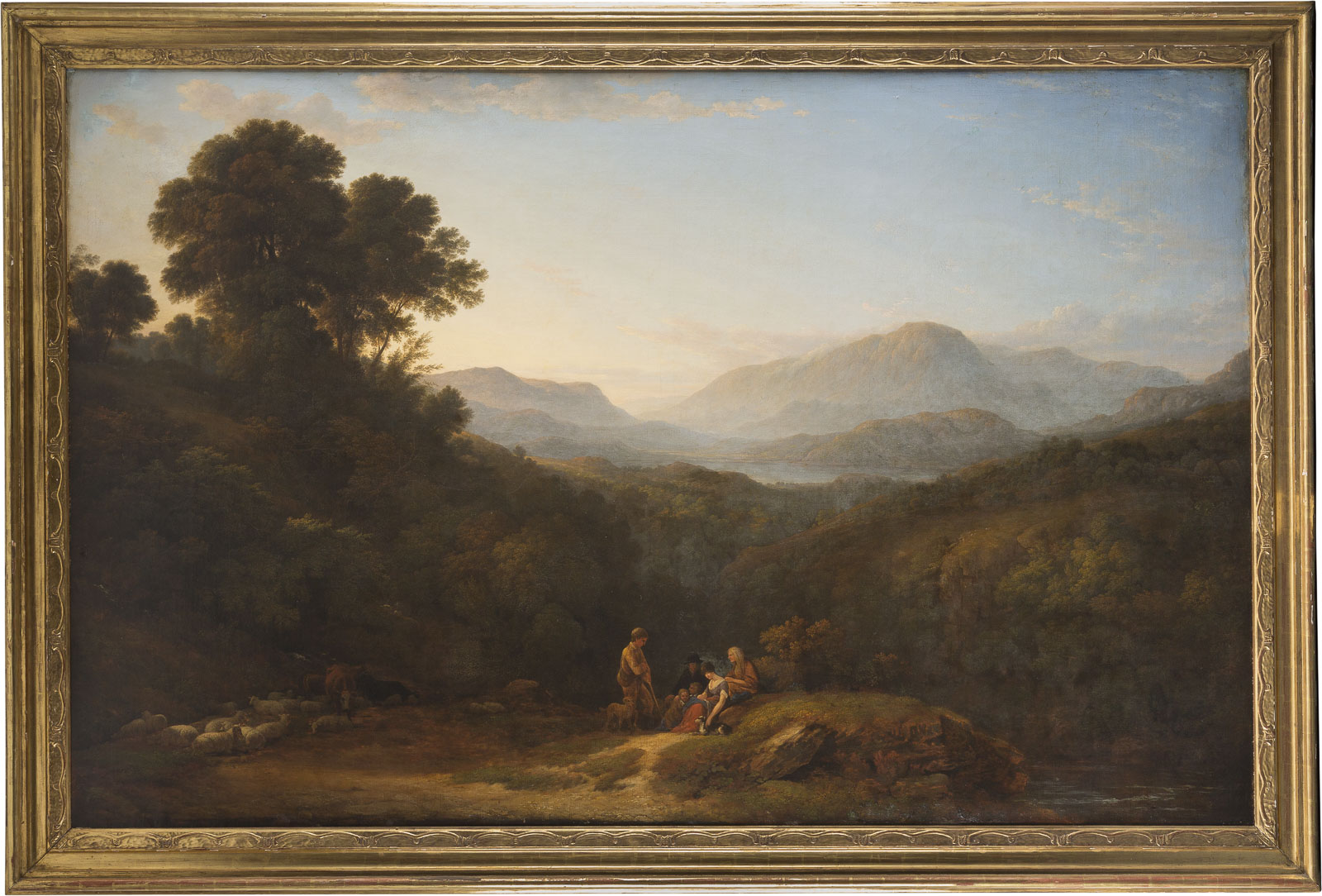 SEHR SELTENE UND MONUMENTALE LANDSCHAFT MIT EINER SCHAFHERDE, RINDERN UND HIRTEN BEI DER RAST IM BILDVORDERGRUND
