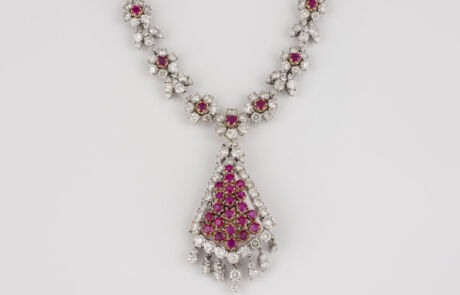 Geprüft 14 K. Ges.-Gew. zus. ca. 58,7 g. Collier mit 19 rund facettierten Rubinen, zusammen ca. 3,8 ct., 274 Brillanten (zwei kleine Brillanten fehlend, unauffällig), zusammen ca. 17,0 ct. Hängelement mit 21 rund facettierten Rubinen, zusammen ca. 3,3 ct., 35 Brillanten, zus. ca. 5,8 ct. Vom Collier zu separieren und als einzelnen Anhänger oder auch Brosche zu tragen. Part. Tragespuren.
