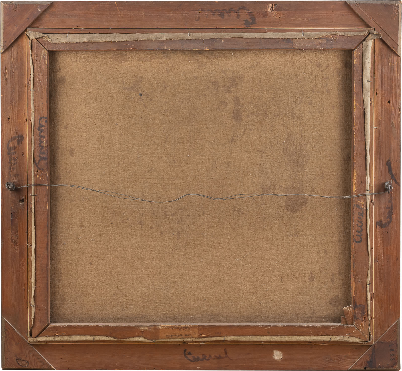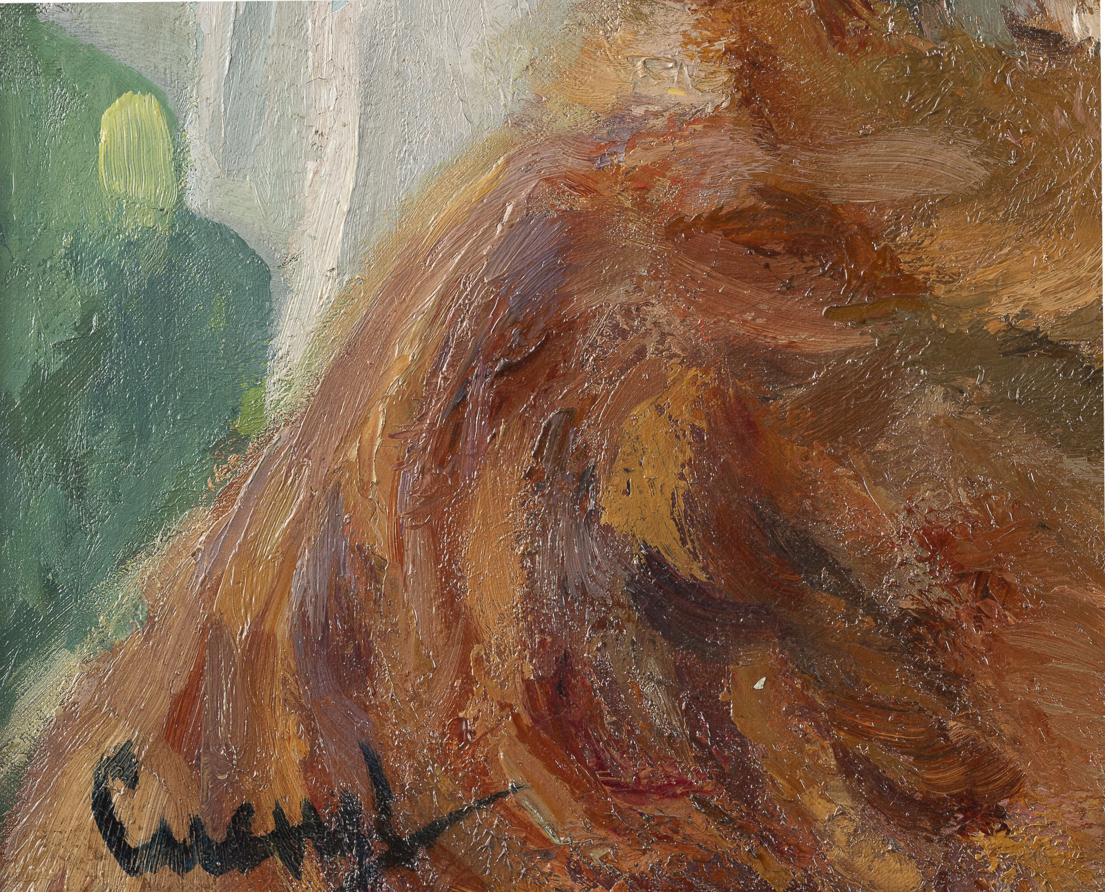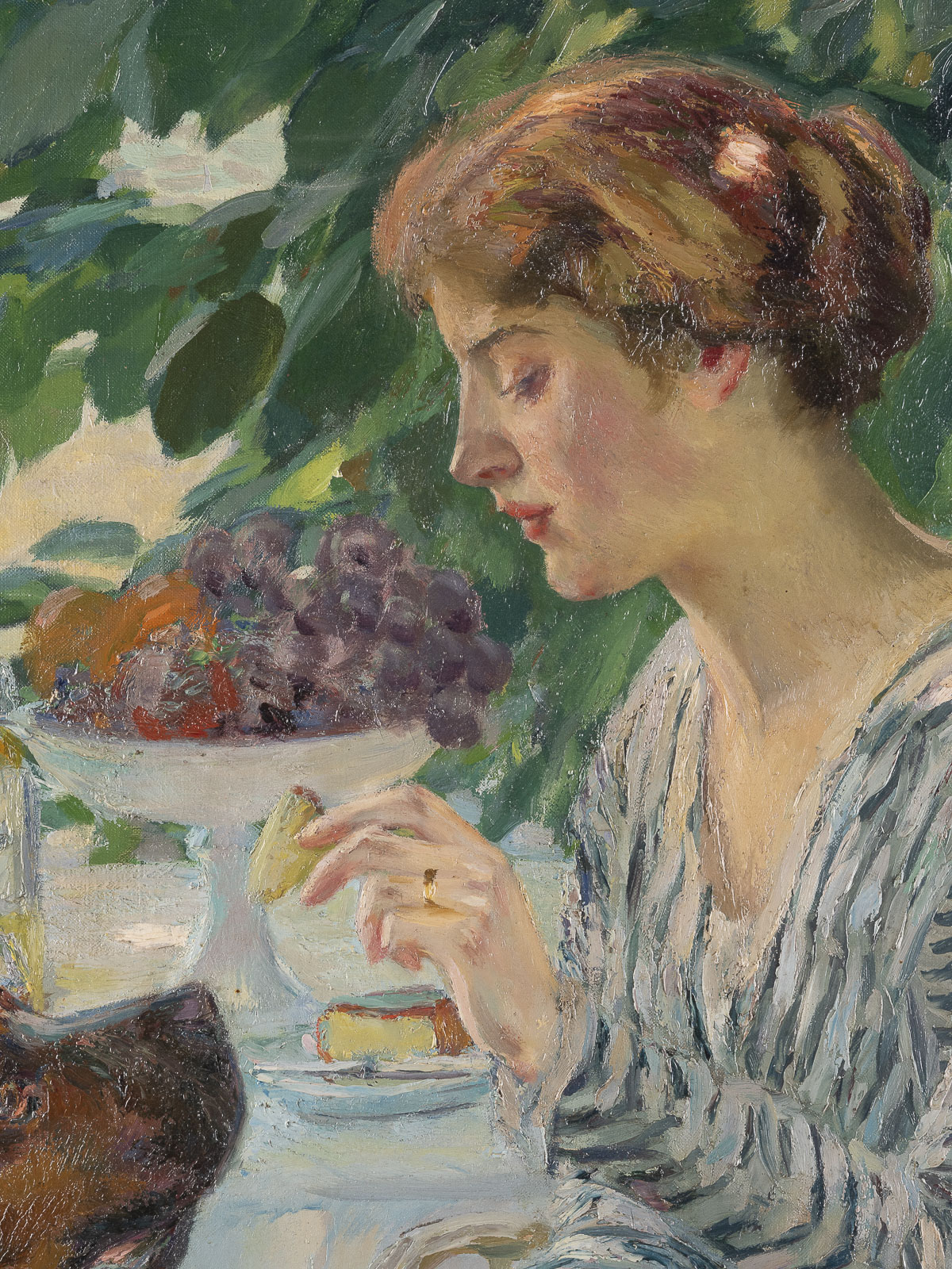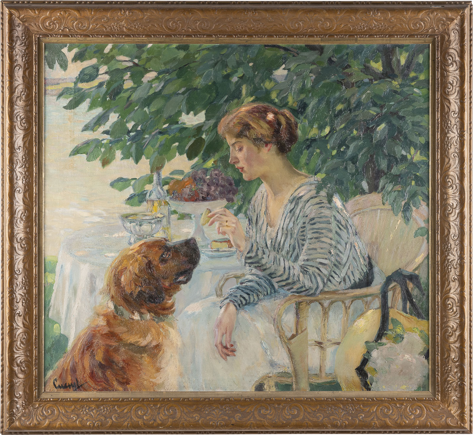 Signiert unten links 'Cucuel'. Verso: Auf dem Keilrahmen und Rahmen mehrmals signiert 'Cucuel' sowie signiert und betitelt auf einem Etikett auf dem Keilrahmen und nochmals betitelt auf einem anderen Etikett. Edward Cucuel entdeckte schon in jungen Jahren seine Liebe für die Kunst. In seiner Heimatstadt San Fracisco begann er ein Studium an der Kunstakademie und arbeitete nebenbei als Illustrator für den 'Examiner'. Mit 17 besuchte er in Paris die Académie Colarossi, die Académie Julian und die Académie des Beaux-Arts, wo er unter Jean-Léon Gérôme lernte. Nach seinem Studium schloss er sich zusammen mit Leo Putz der Künstlergruppe ''Scholle'' an, der ihm die Freilichtmalerei näherbrachte. In Deutschland fand er seine wahre Heimat, die er erst aufgrund des 2. Weltkrieges für immer verließ. Edward Cucuel fand bereits während seiner Lebzeiten große Anerkennung und wurde durch zahlreiche Ausstellungen geehrt und erhielt mehrere Preise. Seine Werke, die vom französischen Impressionismus beeinflusst sind, vermitteln das Gefühl der Befreiung des Stils und drücken eine ungemeine Lebensfreude aus. Bevorzugte Motive Cucuels sind sowohl Porträts als auch Akte von Frauen wie auch Gesellschafts- und Landschaftsszenen. Mit dem hier angebotenen prachtvollen Werk Edward Cucuels erweitet der Künstler sein Oeuvre der lichtdurchfluteten Seenlandschaften, den Portraits junger Damen und des sommerlichen Flairs um den 'Leckerbiss'. Cucuel bezieht sich mit großer künstlerischer Leichtigkeit auf einen der innigsten Momente zwischen Mensch und Tier. Ganz nah wirkt die Begegnung, so als ob die Zeit still stehen würde und macht dieses Gemälde Cucuels zu einem der Höhepunkte seines Wirkens.