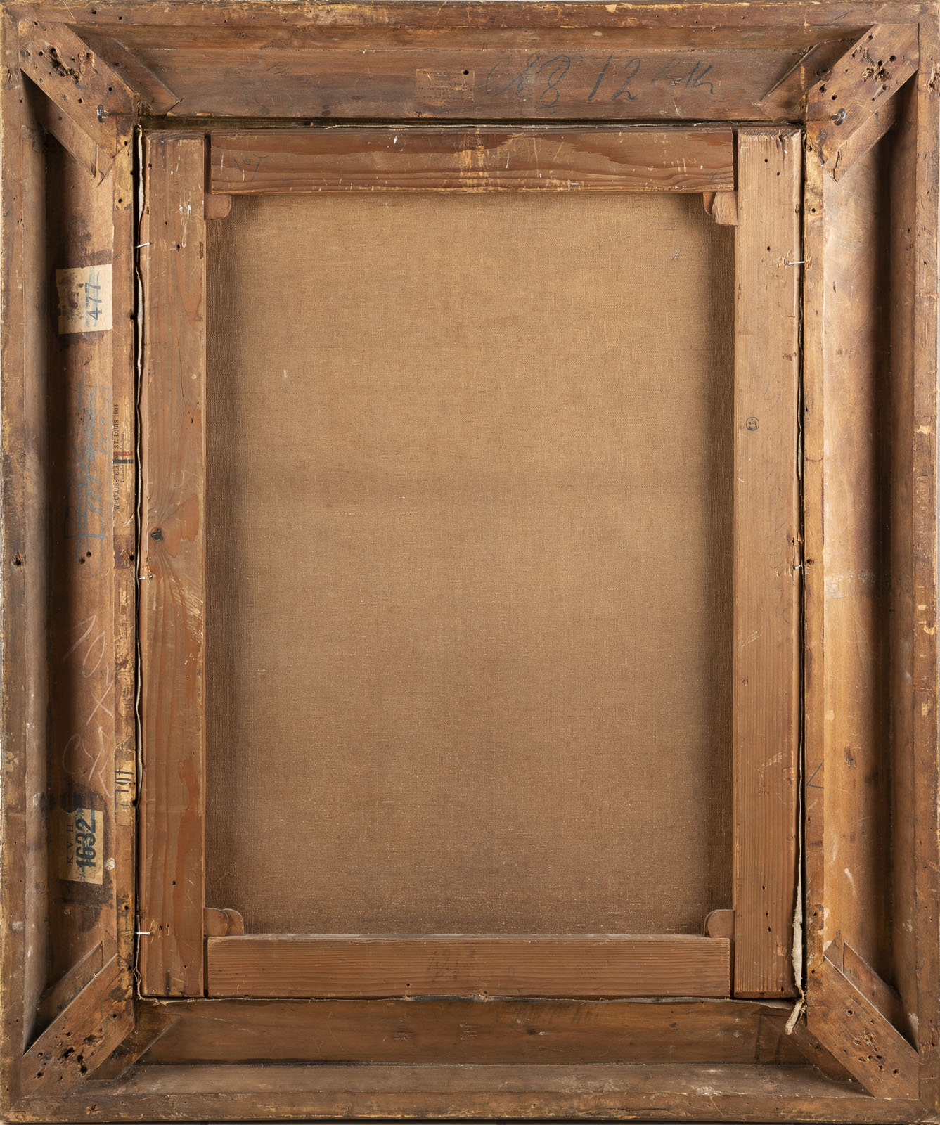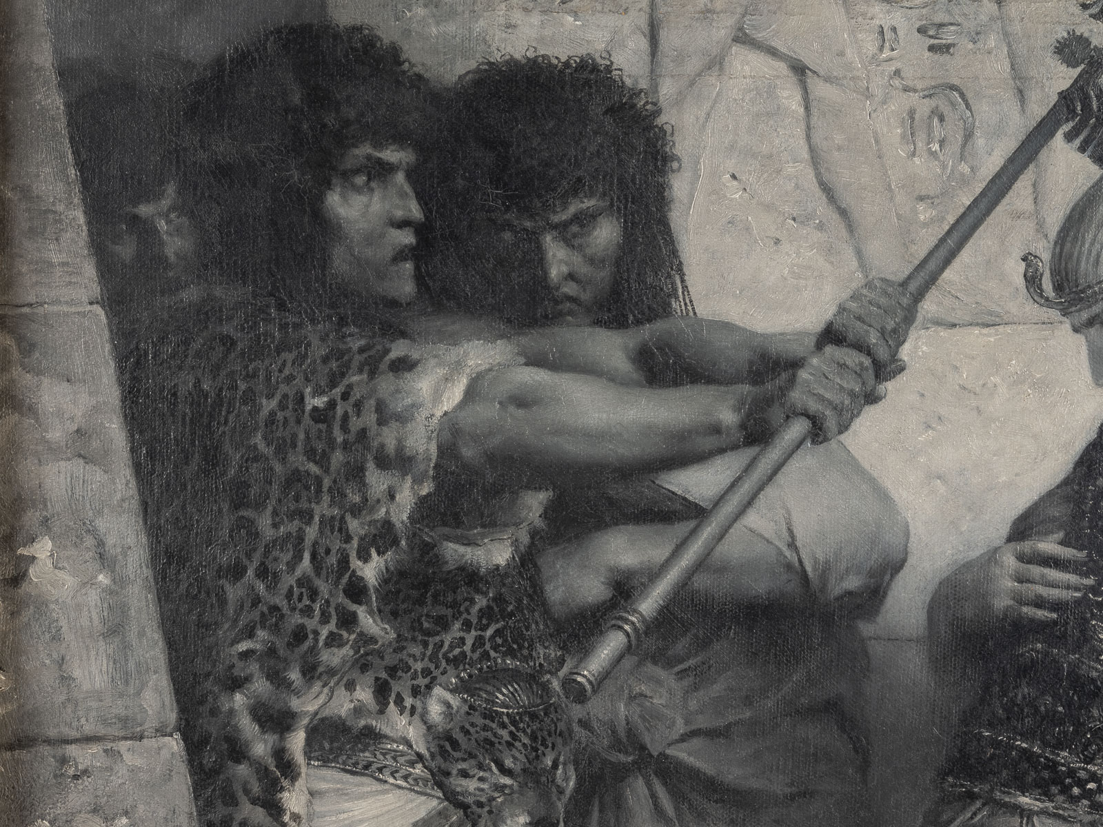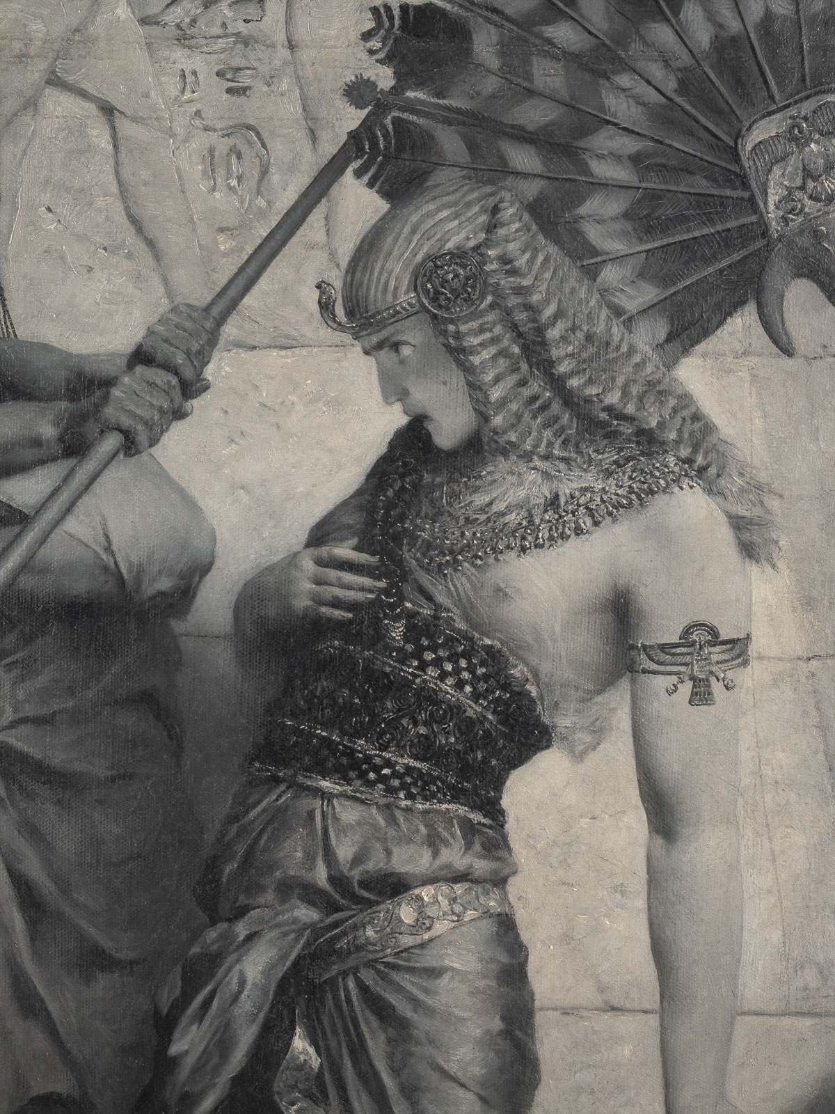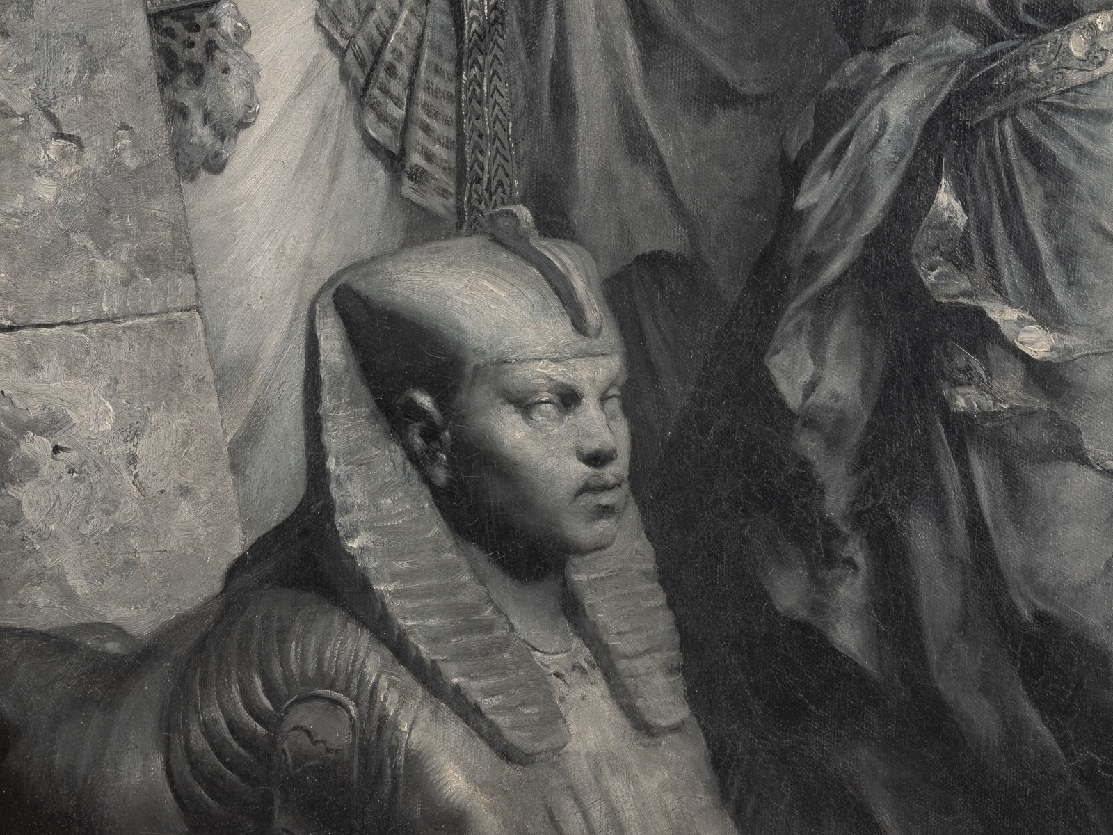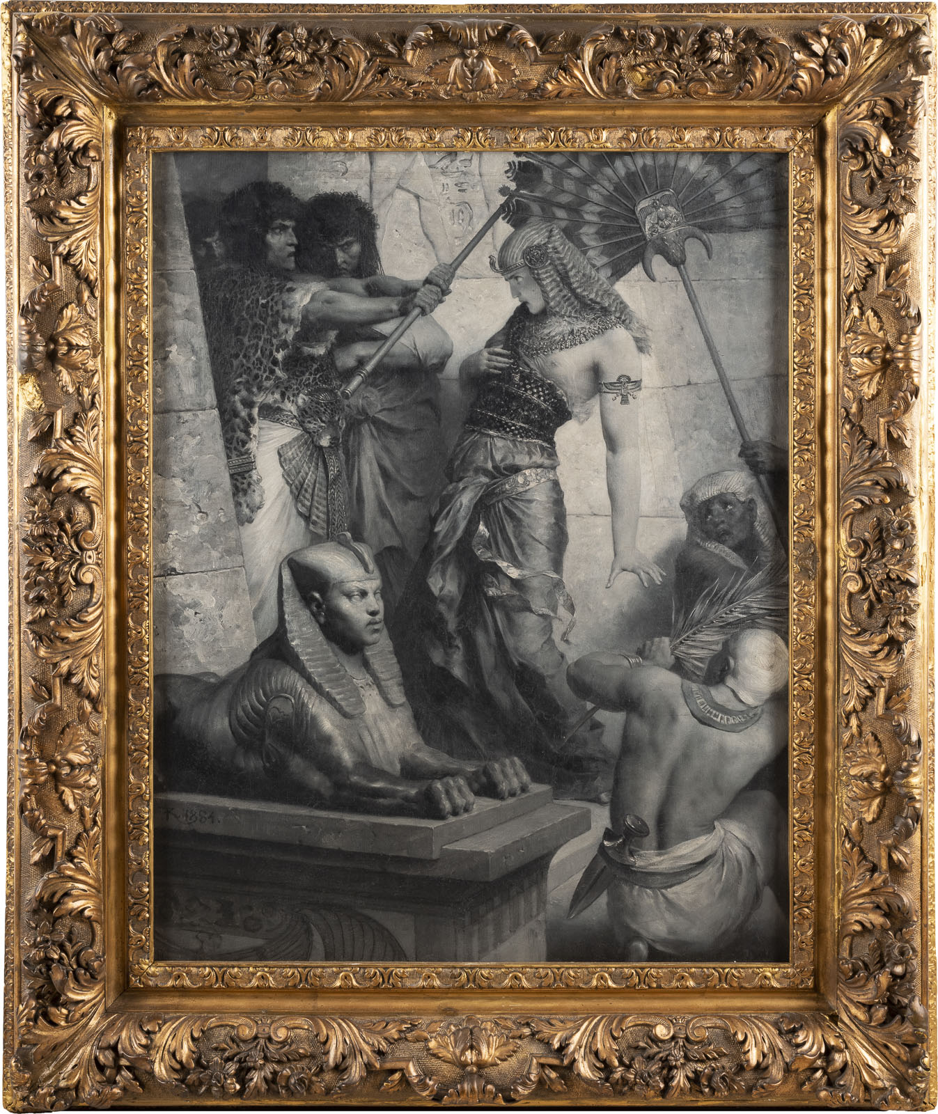 Monogrammiert und datiert auf dem Sockel links 'FK (in Ligatur) 1884.'. Rahmen. Das vorgestellte Gemälde diente den Illustrationen in dem Roman 'Uarda' (1886) des Ägyptologen Georg Ebers als Vorlage, welcher von dem Leben und den Abenteuern der alten Ägypter handelt. Ferdinand Keller hat für seine Darstellung den Moment gewählt, in dem der Oberpriester auf der Schwelle der Tempelpforte der Tochter des Pharaos Ramses II. den Eintritt verwehrt. Ab Mitte der 1870er Jahre illustriert Ferdinand Keller in Zusammenarbeit mit weiteren Künstlern für den Stuttgarter Verlag Hallberger verschiedene Prachtausgaben. Die Illustrationen zu der Publikation von Ebers demonstrieren, wie dynamisch und wahrheitsgetreu Keller den Inhalt der Texte mit seiner Feder darzustellen vermochte und warum ihn seine Zeitgenossen oft mit dem Wiener Künstler Makart verglichen. Was Ferdinand Keller zu Lebzeiten Ruhm eingebracht hat, ist in erster Linie sein wohldiszipliniertes, für alle Anforderungen der Malerei gerüstetes Können. Er ist einer der letzten historischen Maler des großen akademischen Stils, der die monumentalen Wandfresken genauso gut beherrschte wie kleinformatige Illustrationen oder Theaterdekorationen. Literatur: F.W. Gaertner, 1912, S. 46., Abb. 32; Michael Koch. Ferdinand Keller Leben und Werk. 1978. Provenienz: Süddeutsche Privatsammlung.