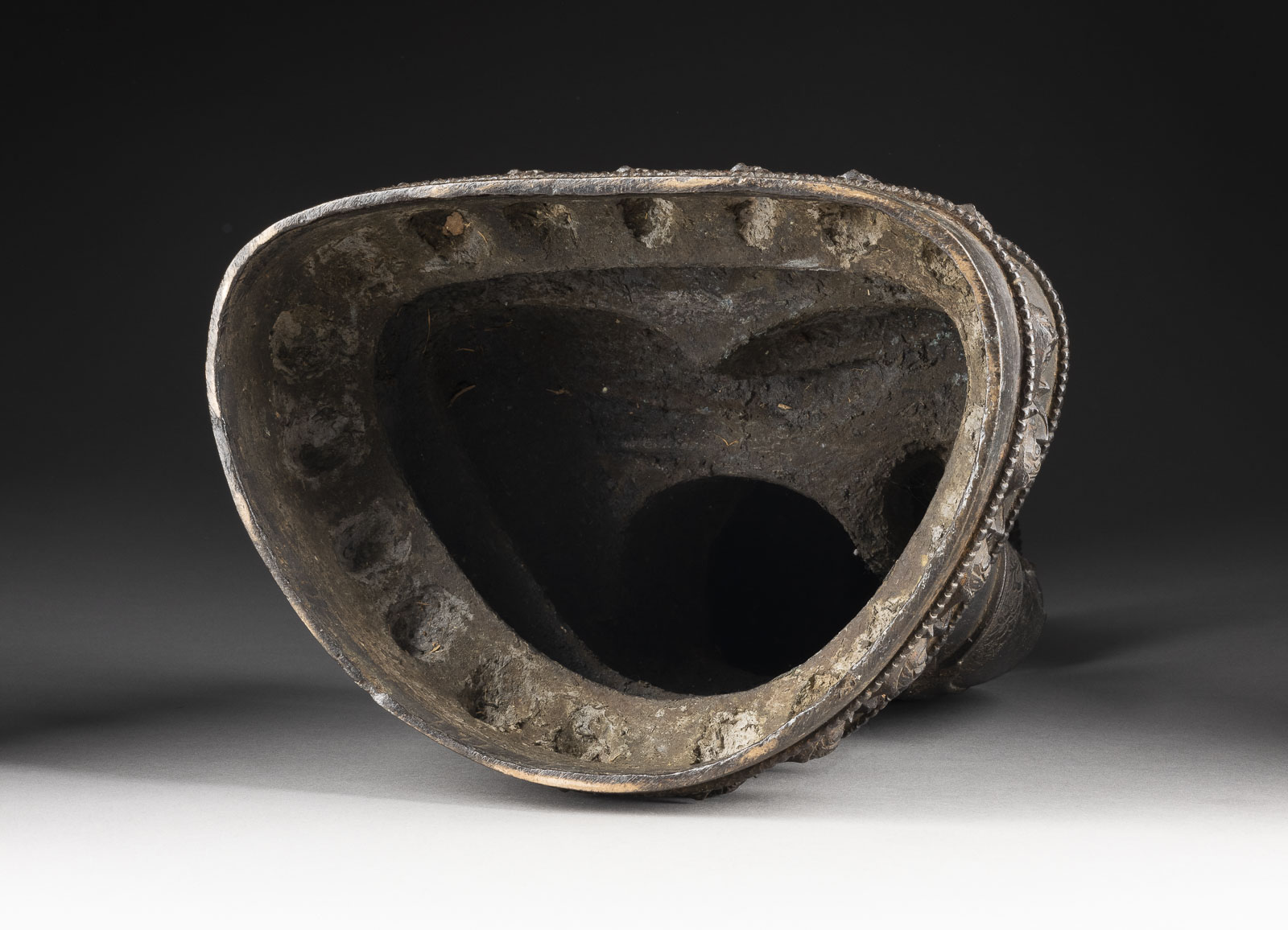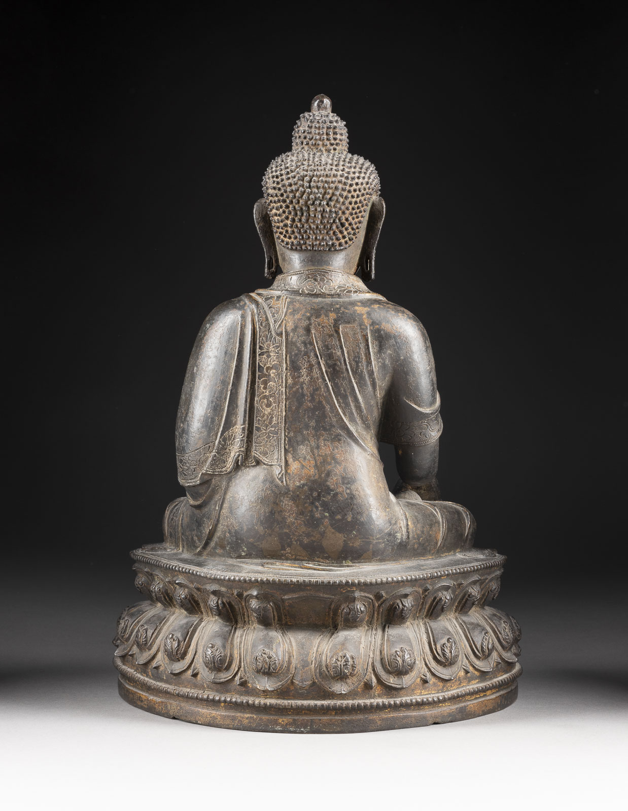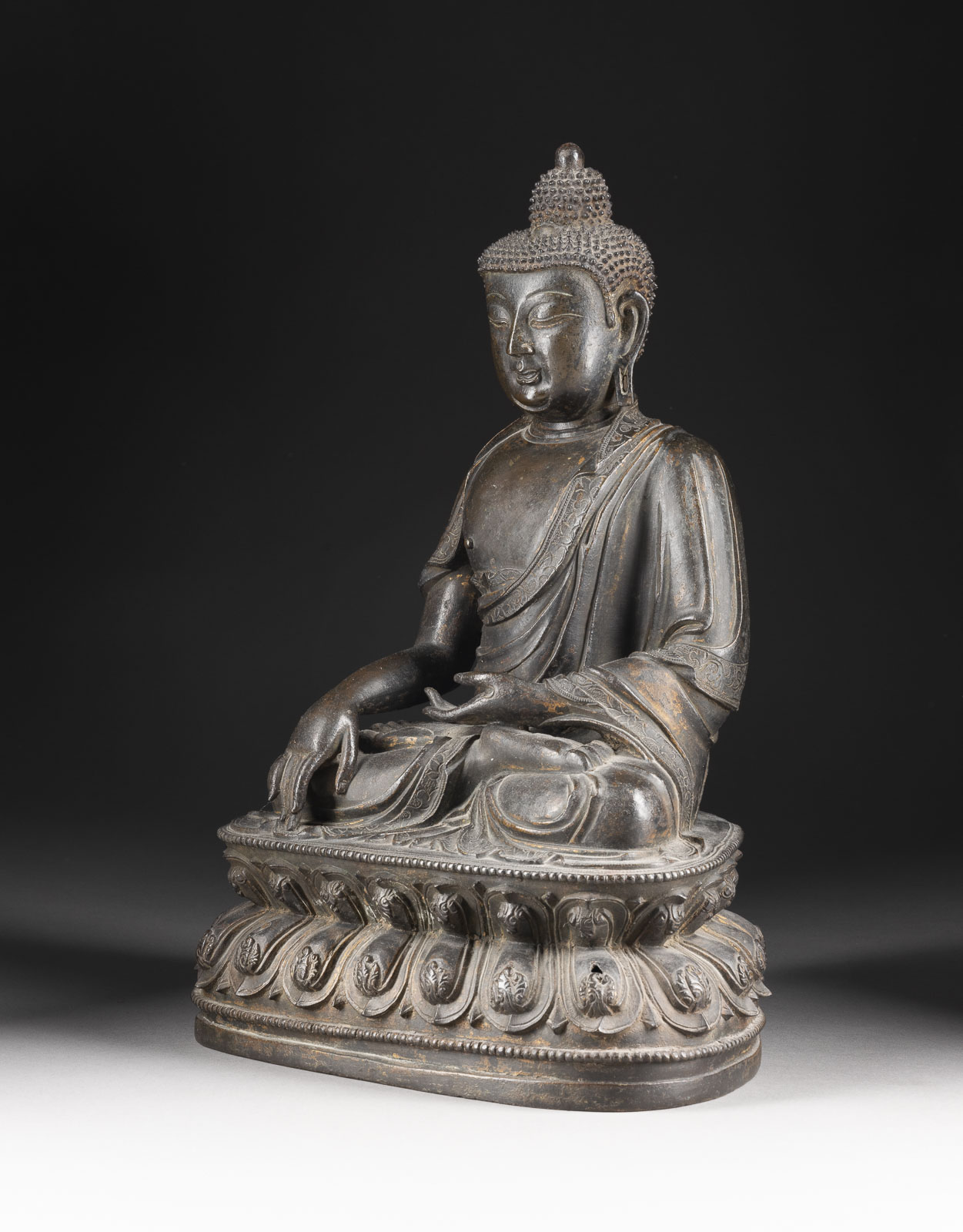Shakyamuni sitzt in dhyanasana auf einem doppelten Lotussockel mit der rechten Hand in bhumisparsha mudra und der linken Hand in dhyana mudra. Die Figur ist in eine Robe mit fein geschnitzten Blumenmustern entlang der Säume gekleidet. Part. besch., mit Alters- und Vergoldungsspuren. Vergleichbar mit einer sitzenden Figur von Tathagata-Buddha (ID36818) in der Sammlung des Museums für Asiatische Kunst in Berlin und einer sitzenden Figur von Medizinbuddha (Lot 637), die im März 2018 bei Christie's New York verkauft wurde. Beide sind etwas kleiner als dieses Los. Provenienz: Aus einer süddeutschen Privatsammlung.