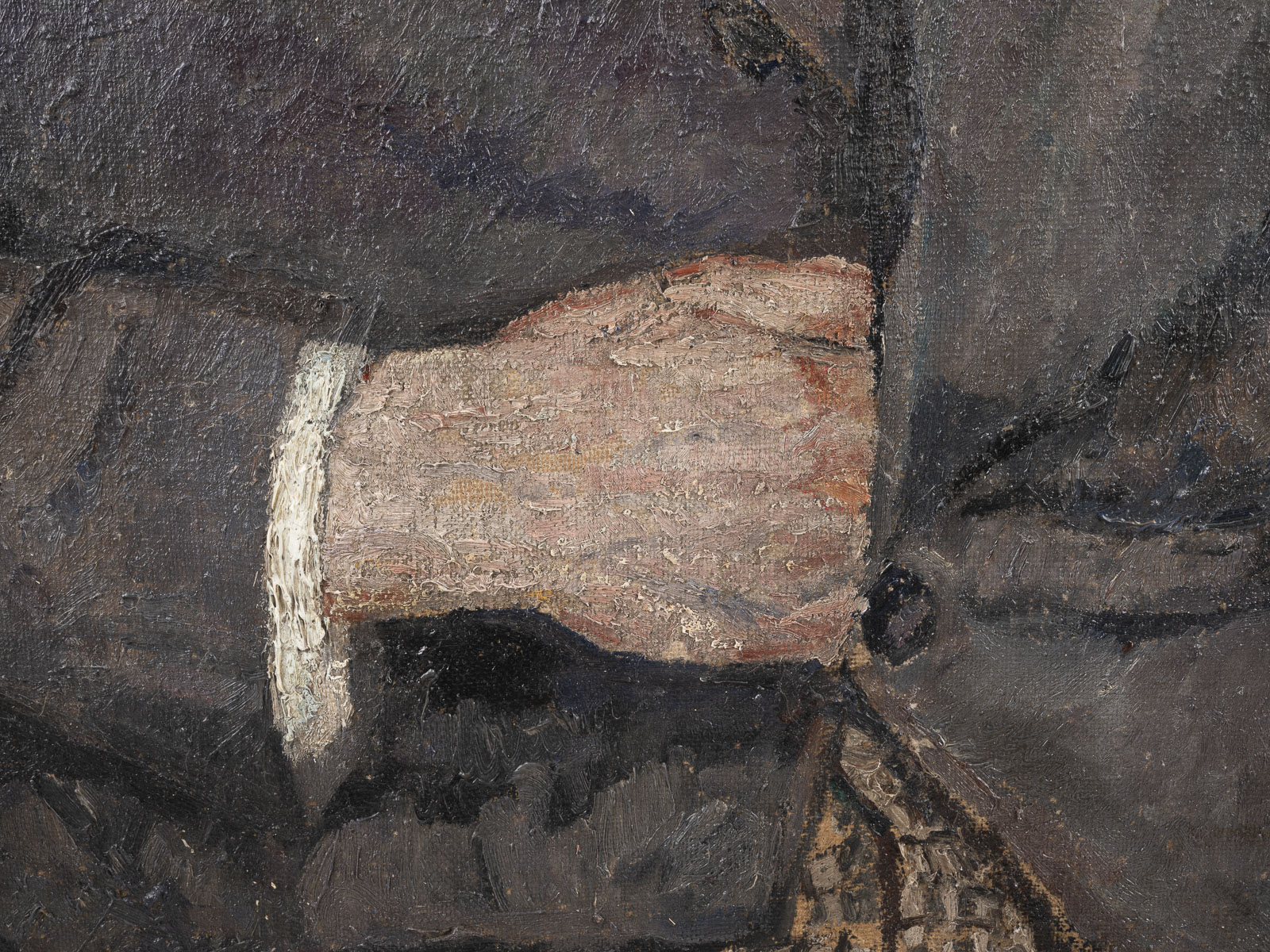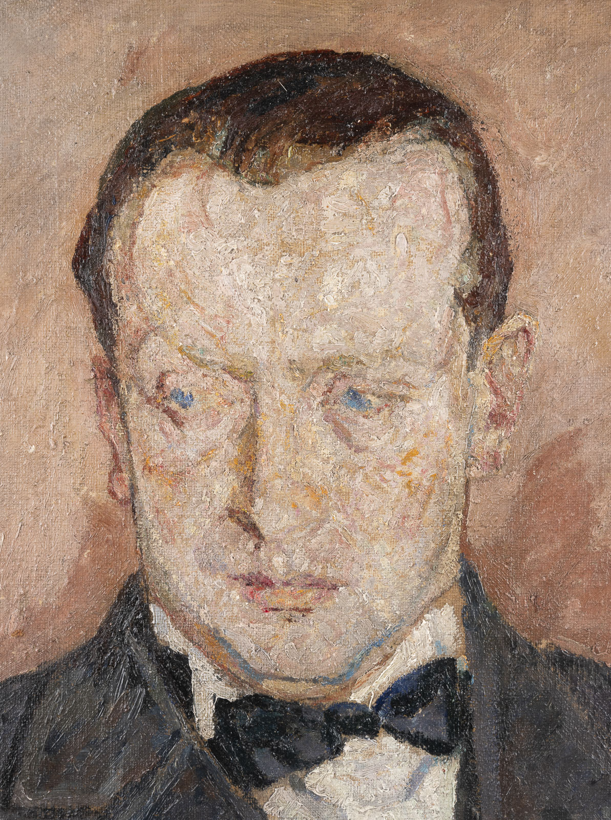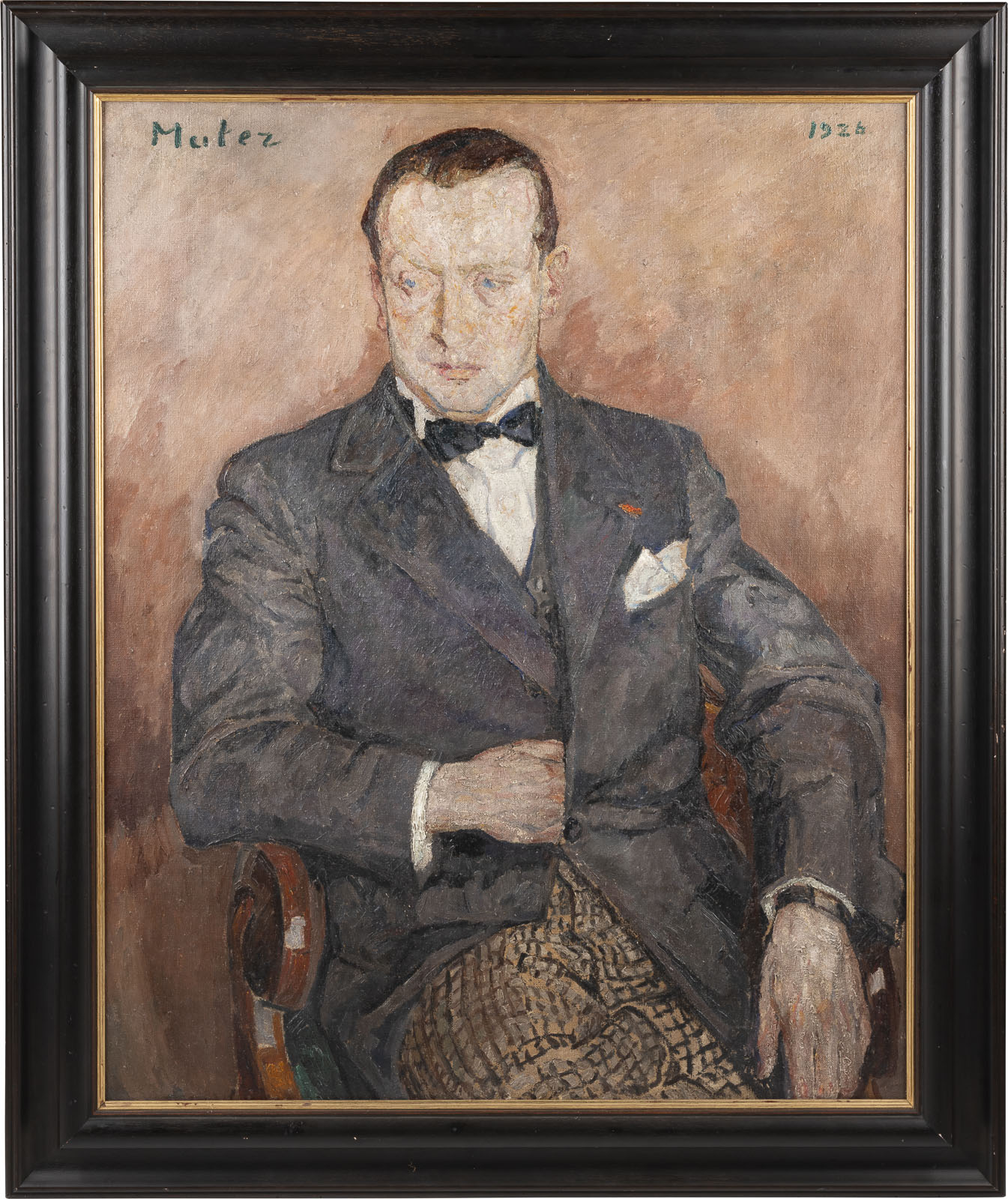 Oben links signiert 'Muter' sowie oben rechts datiert '1926'. Verso: Rückseitig mit Klebeetikett 'Papillon Gallery, Los Angeles' sowie 'Polswiss Art, Warschau'. Mela Muter, eigentlich Maria Melania Mutermilch, wurde 1896 in Warschau geboren und besuchte die Malschule für Frauen von Milosz Kotarbinsky in Warschau. Muter war kurzzeitig Studentin an der Académie Colarossi und der Académie de la Grande Chaumière in Paris. Bereits im Jahr 1901 zog sie mit ihrem Ehemann, den Schriftsteller und Kunstkritiker Michal Mutermilch nach Paris, wo sie Kontakte in der Pariser Kunstszene knüpfte, unter anderen mit Arthur Honegger, Anatole France, Romain Rolland, Auguste Perret und Edgar Varèse sowie den polnischen Künstlern Henryk Sienkiewicz, Wladyslaw Reymont und Bronislaw Huberman. Das hier angebotene 'Portrait eines Mannes' aus dem Jahr 1926 zeigt die Darstellung einer männlichen Person auf einem Sessel sitzend. Vor dem neutralen Hintergrund platziert, dominieren vor allem die Brauntöne in diesem Gemälde. Muter zeigt einen variierenden Farbauftrag, der von der pointillistischen Farbauftrag im Bereich des Gesichts hin zu einem langen Pinselduktus im Bereich der Darstellung der Kleidung. Ihre Werke wurden seit 1902 in der Société nationale des Beaux-Arts ausgestellt, deren Mitglied sie seit 1912 war. Zudem stellte sie im Salon d'Automne sowie seit 1924 im Salon de Tuileries aus. Es folgten mehrere Beteiligungen bei Gruppenausstellungen, wie bei Druet, Billiet und in der Galerie La Renaissance in Paris, bei Thannhauser in München, in der Galerie Dalman in Barcelona sowie im Carnegie Institute in Pittsburgh. Ihre Werke wurden von Paul Cézanne, Paul Gaugin und Vincent van Gogh beeinflusst und zeigen vornehmlich Portraits, Landschaften und Stillleben. Die Zeit während des Zweiten Weltkrieges verbrachte Muter im Süden Frankreichs in Avignon, bevor sie wieder nach Paris zurückkehrte. Aufgrund der Verschlechterung ihrer Sehkraft konnte Muter jedoch nur noch eingeschränkt weiterarbeiten. Im Jahr 1927 erhielt Muter die französische Staatsangehörigkeit. Und 1945 kehrte sie nach Paris zurück, wo sie schließlich im Jahr 1967 verstarb. Ihre Werke befinden sich in den Sammlungen Musée d'Art Moderne und im Petit Palais in Genf, sowie in Museen in Algier, Avignon, Barcelona, Belfort, Gerona, La Rochelle, Lwow, Lyon und Nantes. Das Portrait eines Mannes von Mela Muter wurde in den 1970er Jahren von der Papillon Gallery in Los Angeles als Portrait von Arthur Honegger geführt. Rahmen. Provenienz: Papillon Gallery, Los Angeles, wohl nach 1972 bis ca. 2000; seit 2014 Privatsammlung Polen.