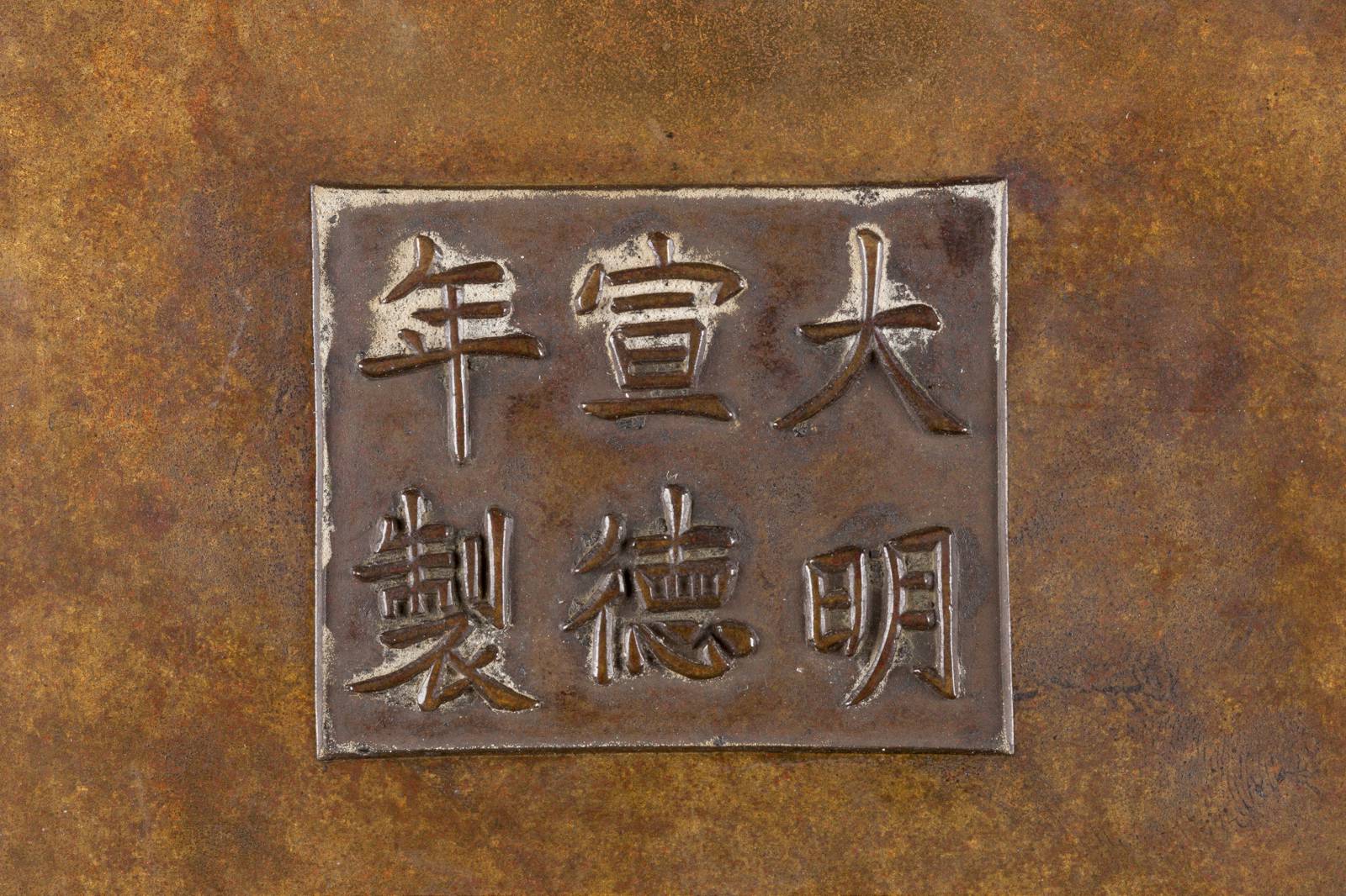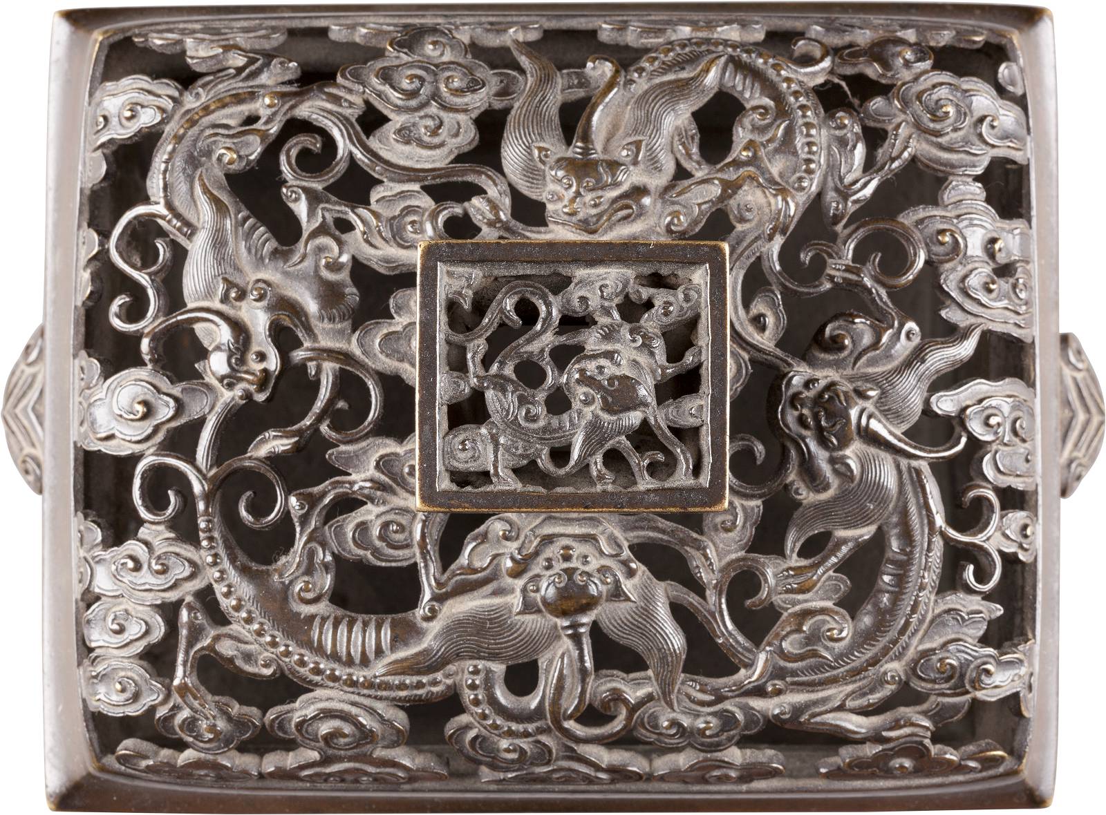 Auf der Bodenunterseite Qianlong-Sechszeichen-Marke. Im Querschnitt rechteckiger Korpus. Allseitig in feinem Relief und teils durchbrochen gearbeiteter Dekor: Drachen zwischen Wolkenmotiven. Provenienz: Süddeutsche Privatsammlung.