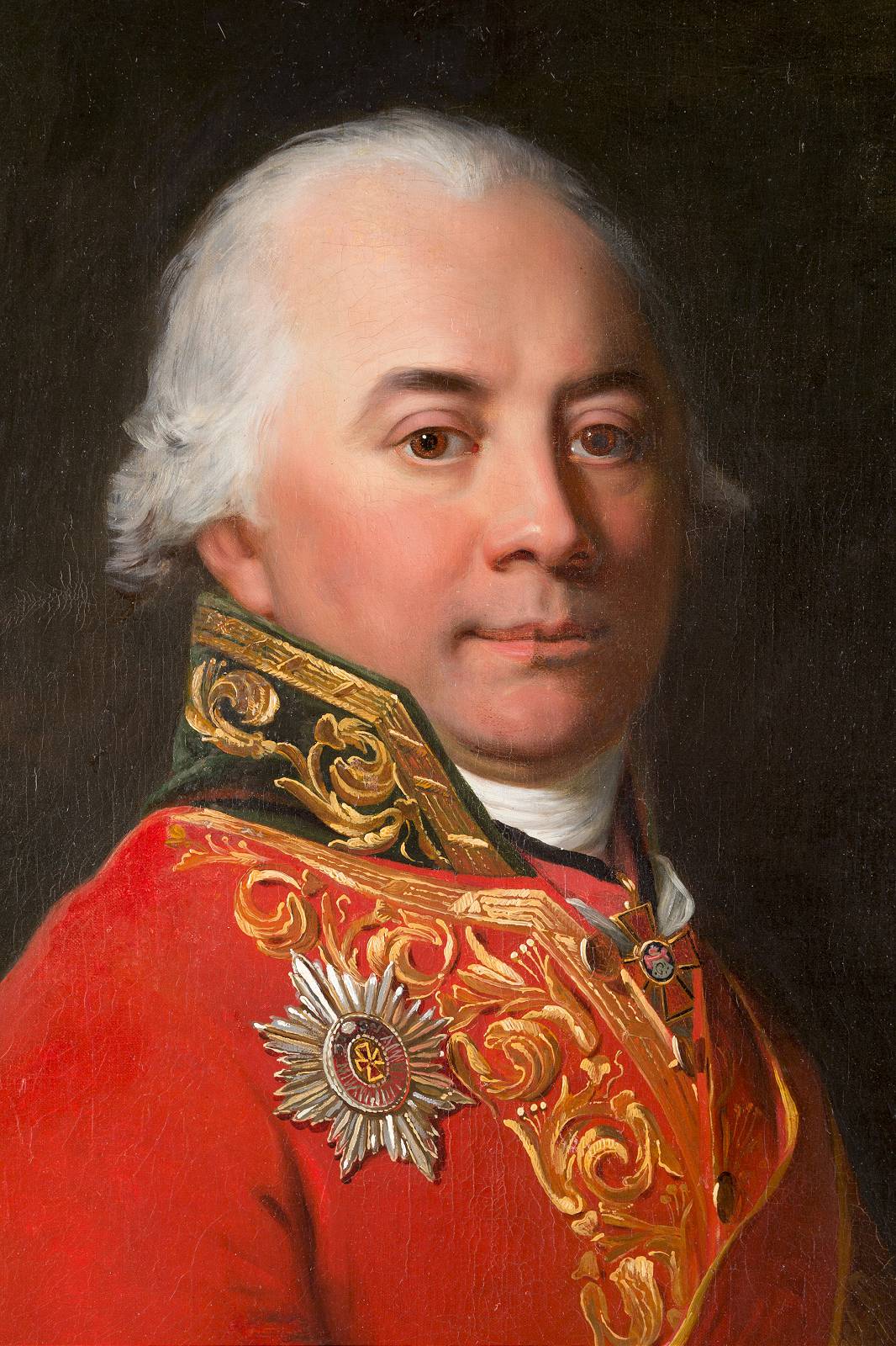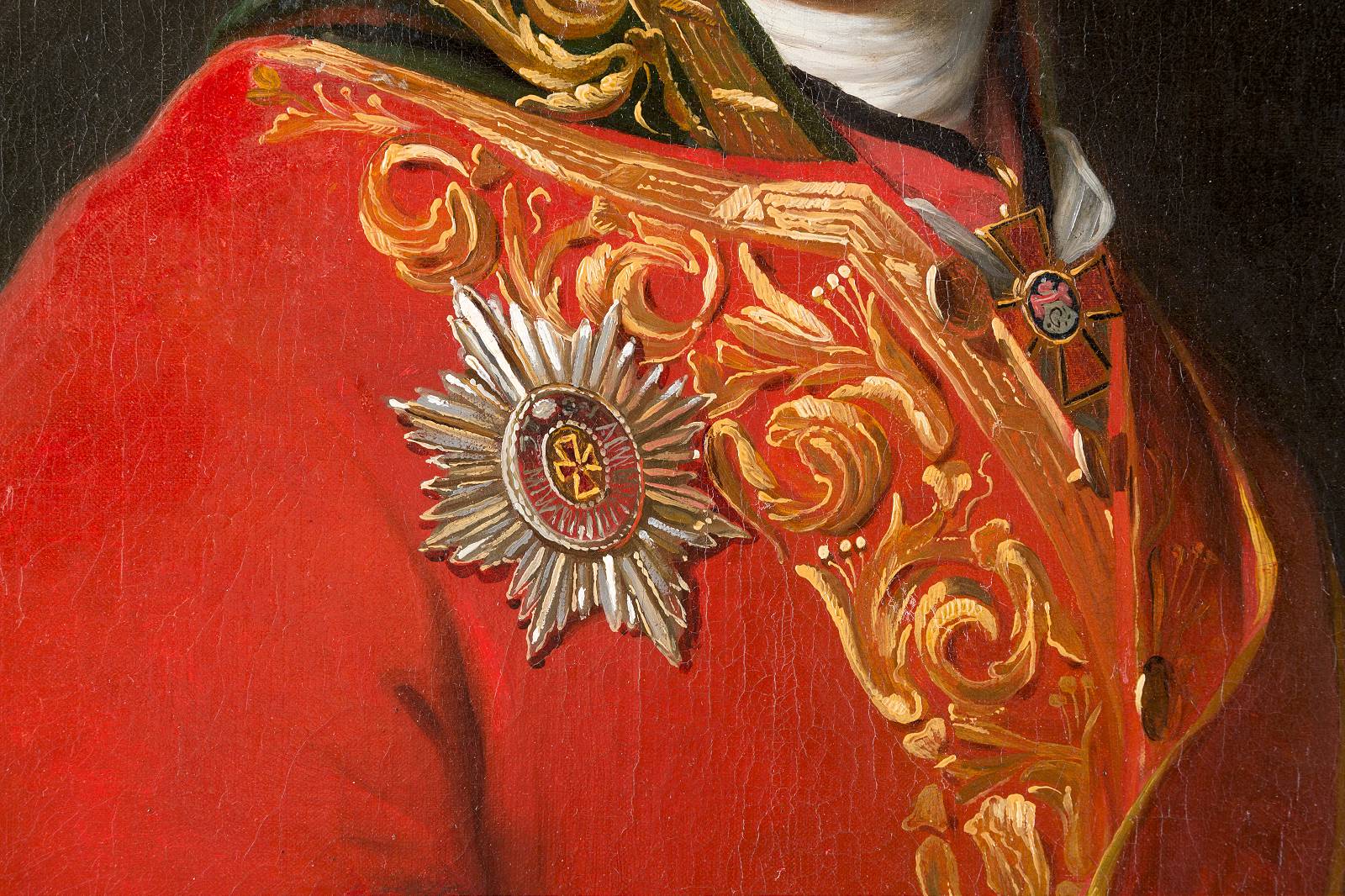 Historisches Porträt eines Mannes in roter Uniform mit Orden, präsentiert in einer Kunstauktion.
