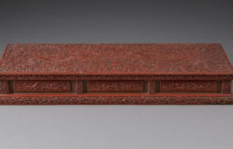 Detailliert geschnitzte, antike rote Lackholzschatulle mit Vogel- und Pflanzenmotiven, ein seltenes Sammlerstück bei Kunstauktionen.