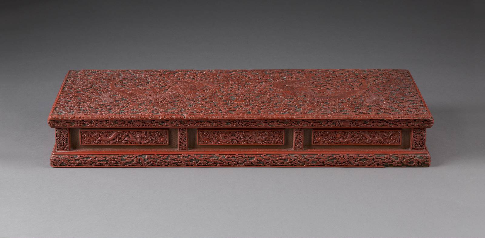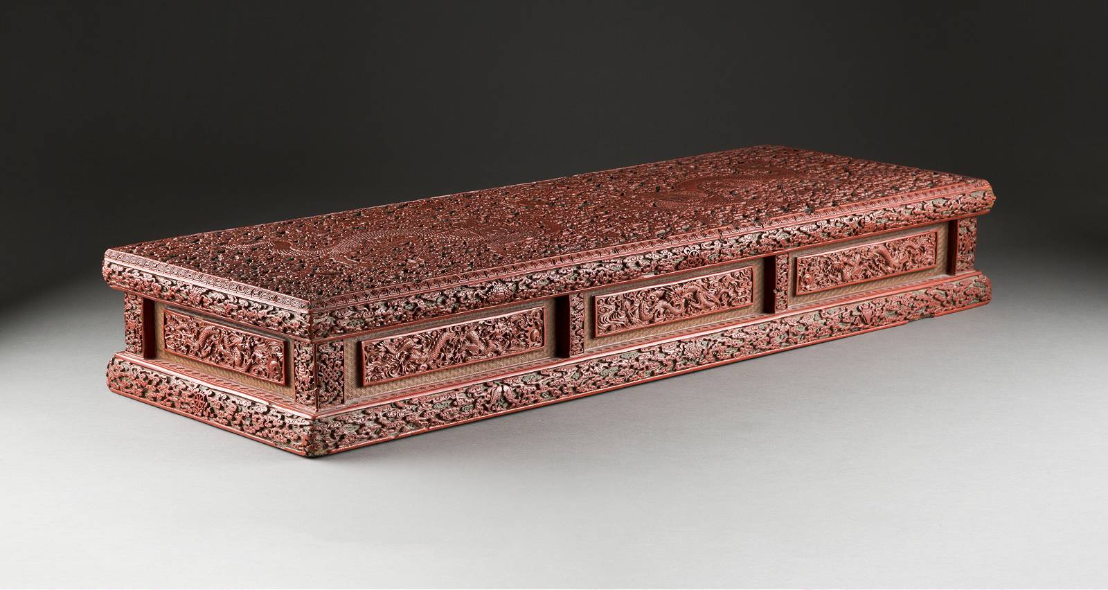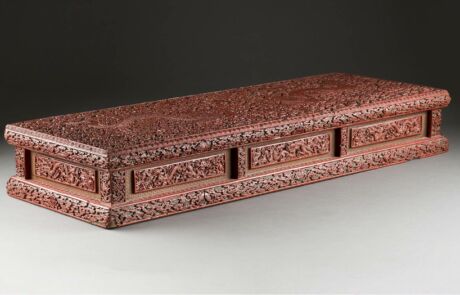 Zwei fünfkrallige Drachen, Fledermäuse sowie flächendeckende Glück bringende Wolken auf der Oberfläche des Sockels. Seitliche Wandungen ebenfalls mit Dekor von Drachen und buddhistischen Glückssymbolen. Provenienz: Alte Düsseldorfer Privatsammlung.