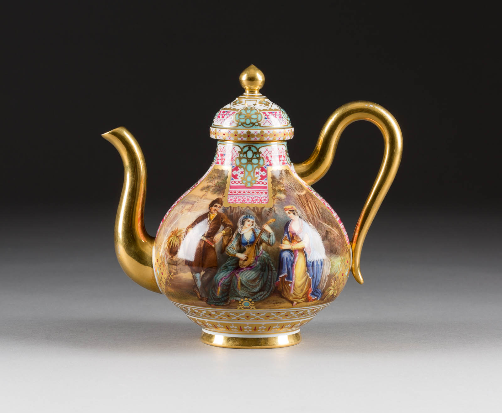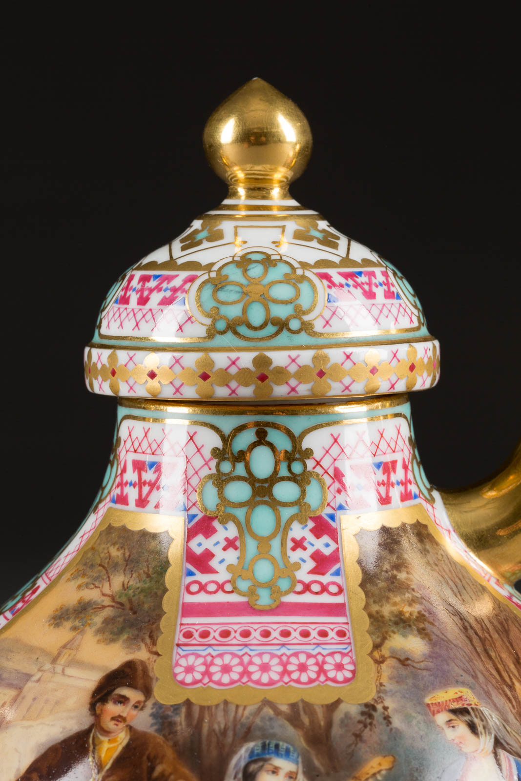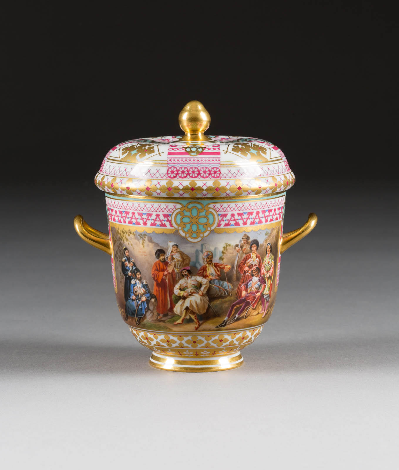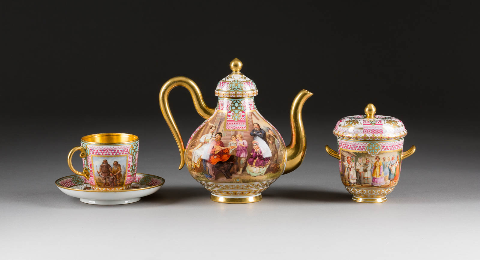Auf der Bodenunterseite unterglasurgrüne Manufakturmarke 'AII' mit Pressnummern. Bestehend aus einer Teekanne, einer Deckel-Zuckerdose und einer Teetasse mit Untertasse. Umlaufend auf der Wandung von geometrischen Bordüren gerahmte Rechteckbildfelder mit sehr fein ausgeführten Darstellungen russischer Völker. Vergoldung min. berieben, Tasse min. rest.