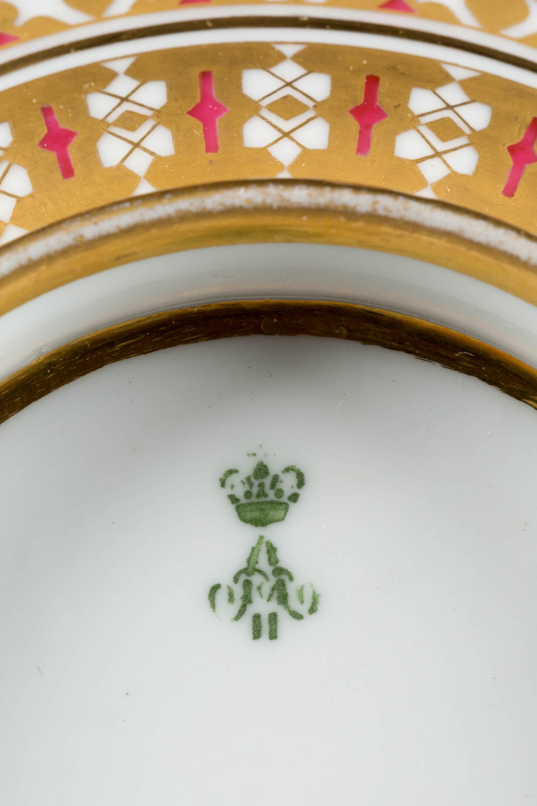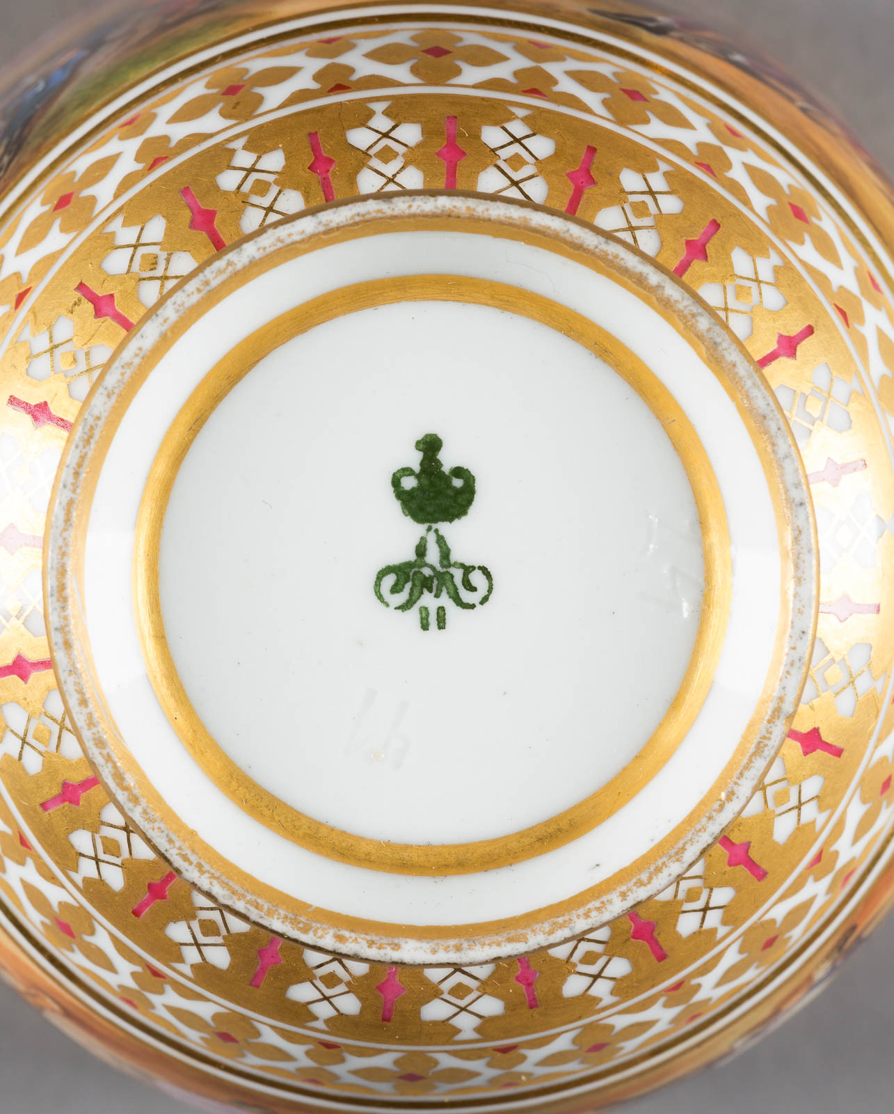 Porzellan, polychrome Aufglasurbemalung, Poliergold