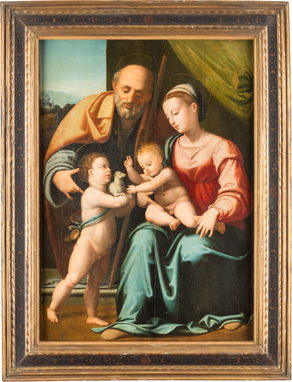 Mittig unten signiert auf der Sockelleiste im Bildzentrum 'ORATE PRO PICTORE F PAVLO PIST'. Paolino di Bernardino di Antonio del Signoraccio, genannt Frau Paolino da Pistoia, wurde 1488 in Pistoia geboren. Er war der Sohn von Antonia di Paolo Maconi und des Malers Bernardino di Antonio del Signoraccio, der ihn als Maler in seiner Werkstatt ausbildete. Mit 15 Jahren trat der junge Paolino dem strengen Dominikanerorden als Novize bei, der erheblichen Einfluss auf den Maler nehmen sollte. In Florenz traf er 1509 auf den bedeutenden Maler und Mönch Fra Bartolomeo (1472-1517), der ihn unterrichtete und selbst ein Anhänger des damals polarisierenden Bußpredigers Girolamo Savonarola war. In der Scuola di San Marco setzte sich Fra Paolino zunehmend mit den religiösen Ideen und Reformationsvorstellungen Savonarolas auseinander, der die Congregazione di San Marco gründete und zu der die meisten auftraggebenden Dominikanerklöster gehörten. Mit dem Tod von Fra Bartolomeo übernahm Fra Paolino die Leitung der Scuola di San Marco. Den Reformforderungen der strengen Savonarola-Regel folgend, widmete sich Fra Paolino verstärkt dem Andachtsbild zu, dessen didaktische Funktion durch kompositorische Vereinfachung und der Verwendung einer intensiveren Farbgebung in den Primärfarben unterstrichen werden soll. Zwischen 1526 und 1528 verlegte Fra Paolino seine florierende Werkstatt endgültig nach Pistoia, wo er am 3. August 1547 schließlich verstarb. Das präsentierte Gemälde Heilige Familie mit dem Johannesknaben stellt ein charakteristisches Beispiel für die Malerei Fra Paolinos dar, der ein kräftiges Farbschema verwendet und dessen Gestaltung der Marienfigur sich in weiteren Werken wiederfindet (u. a. im Gemälde Anbetung der Könige, Sakristei des Klosters S. Domenico, Pistoia; Verkündigung der Geburt, Oratorium der Ss. Annunziata in Vinci, Florenz). Der Künstler hat die intime Szene nah an den Bildrand gesetzt und unterstützt dadurch den Aspekt der Andacht. Die fürbittende Inschrift und Signatur des Malers 'ORATE PRO PICTORE F PAVLO PIST' auf der Sockelleiste zeichnet ihn als Dominikanermönch aus. Die Blicke der Figuren konzentrieren sich auf den Johannesknaben, der dem Jesuskind das kleine Lamm zeigt, wodurch das familiäre Bildthema einen narrativen Charakter erhält und einen Ausblick auf die zukünftigen Ereignisse bietet. Literatur: Alessandro Nesi, PAOLO di Bernardino di Antonio del Signoraccio, in: Dizionario Biografico degli Italiani - Volume 81, Rom, 2014, Istituto della Enciclopedia Italiana http://www.treccani.it/enciclopedia/paolo-di-bernardino-di-antonio-del-signoraccio_(Dizion ario-Biografico)/, (18.07.2019). Provenienz: Bedeutende Privatsammlung Ruhrgebiet.
