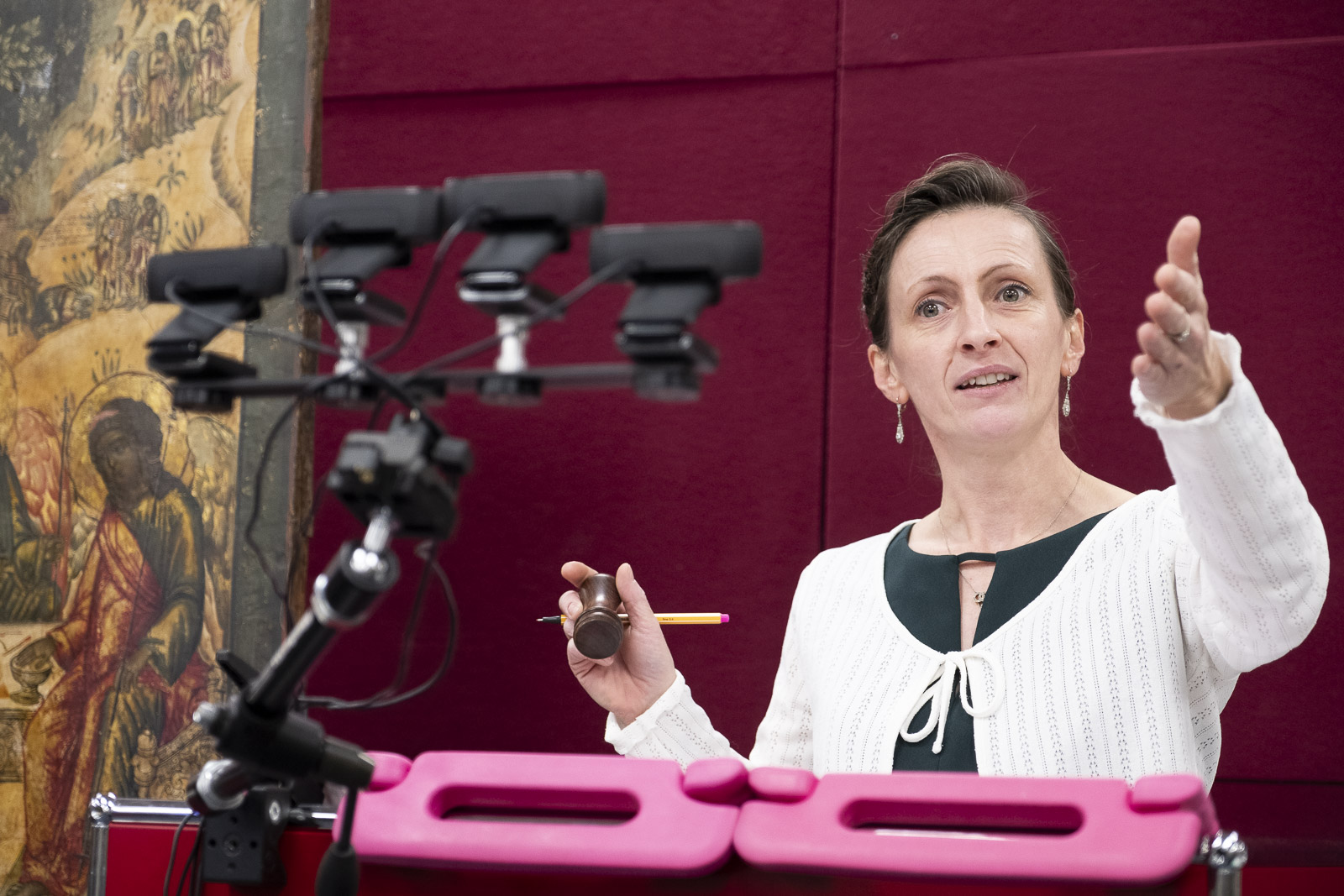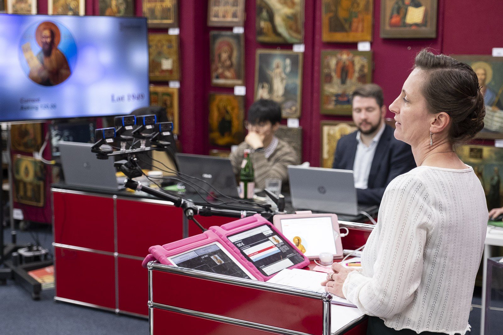 Frau in weißer Bluse steht vor einem roten Hintergrund und hält einen Auktionshammer in der Hand, während sie mit der anderen Hand deutend gestikuliert.